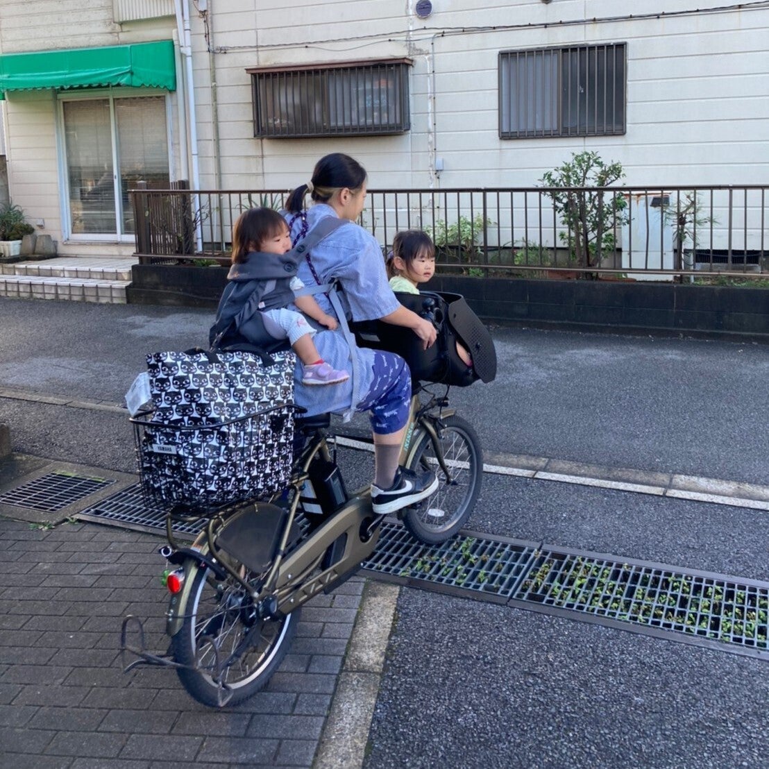 嵐のように準備して自転車の前に長女と背中には次女をおぶって保育園へGO!
