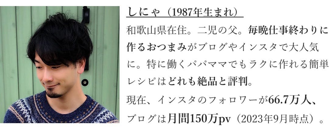 しにゃさんは、家族の夕飯の後に一人台所に立ち、ちゃちゃっと作るのが日課。好みの食材を使いながら、楽しく簡単に作れるレシピが評判です。