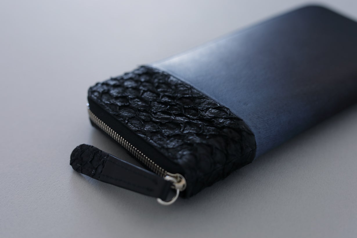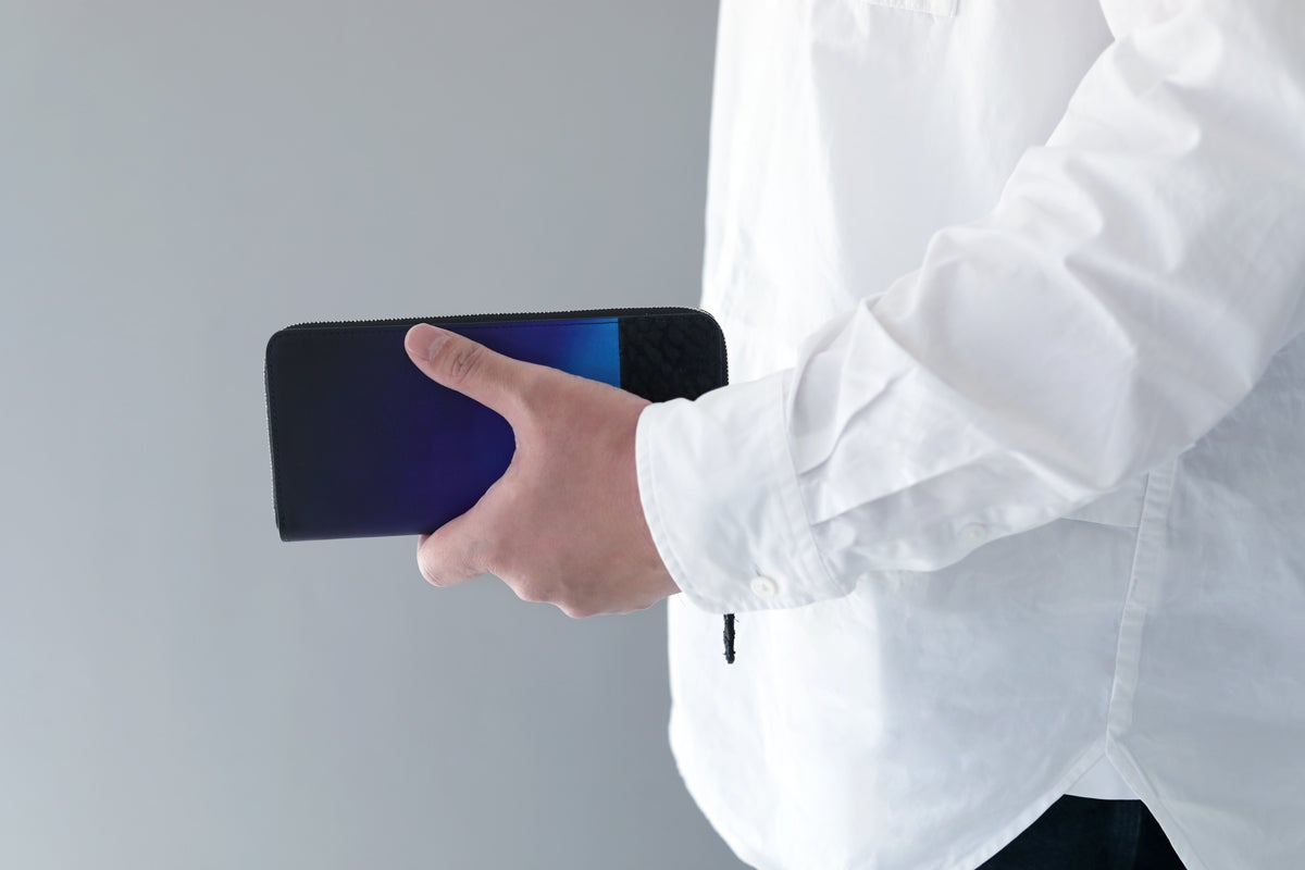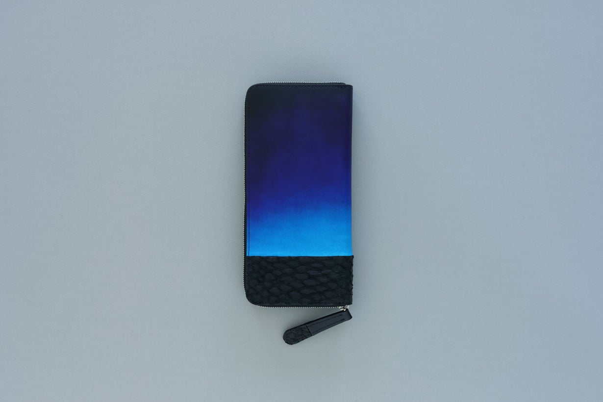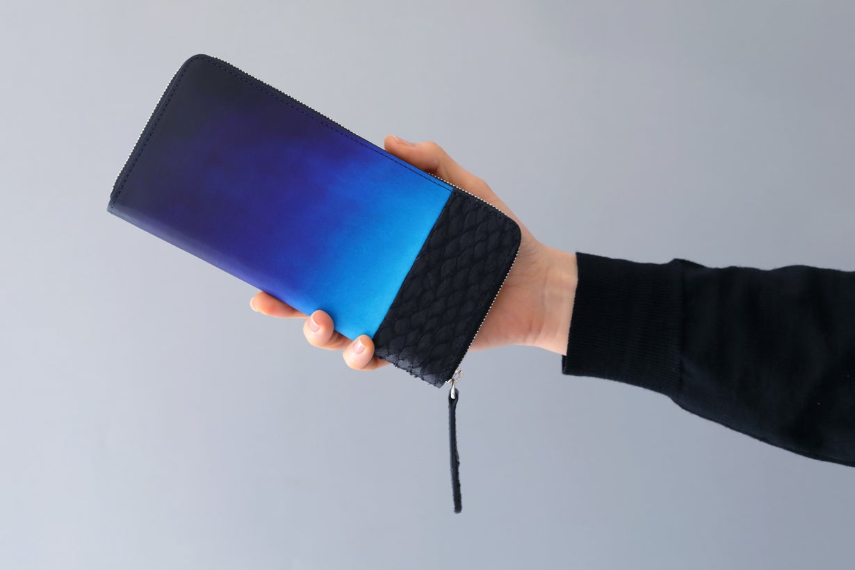 フィッシュレザーの鱗模様を「海の波」に見立て、グラデーションレザーを「変わりゆく空」に見立て、美しい風景をそのままお財布に。