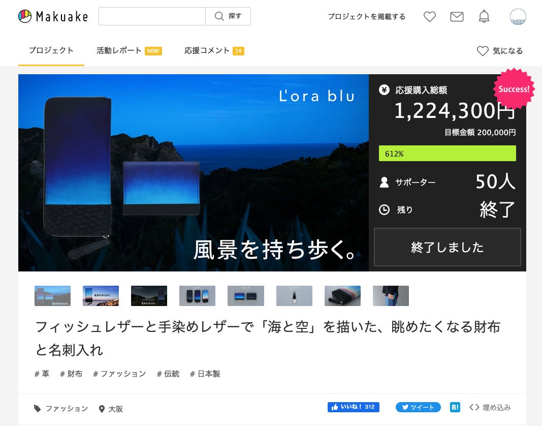 「Makuake(マクアケ)」にて、第一弾プロジェクトを実施したところ、「サポーター50人」「1,224,300円」ものたくさんのご支援をいただきました。