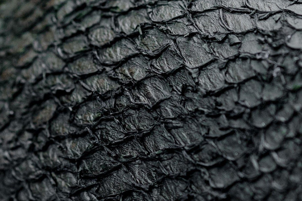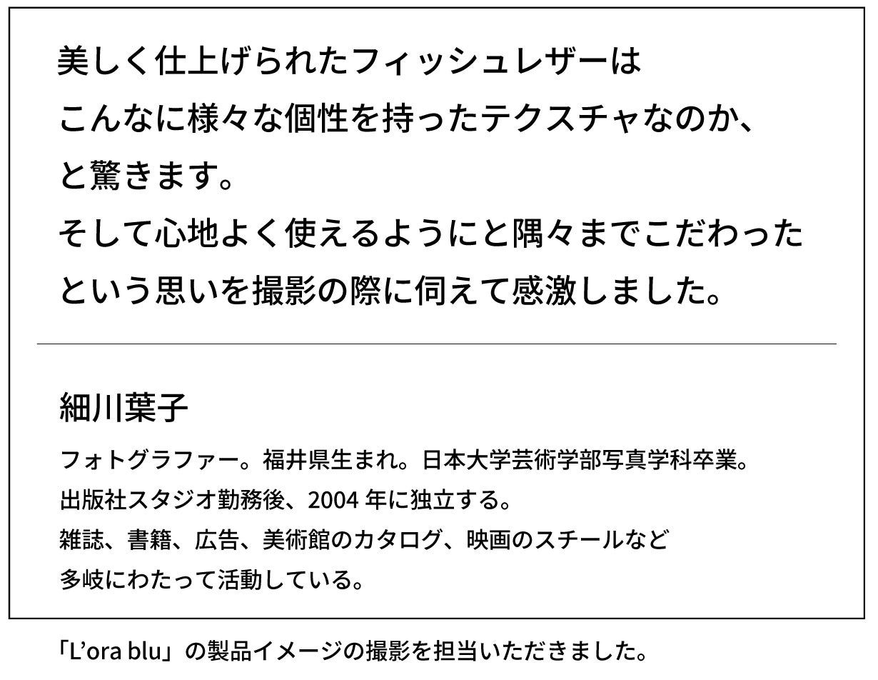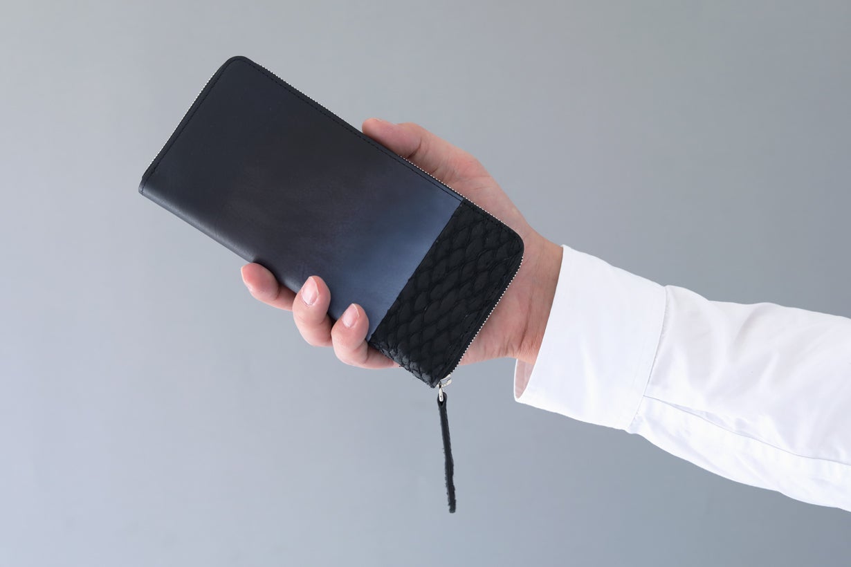 出世魚「ブリ」のフィッシュレザーは、鱗が1〜2mmと細かく滑らかな肌触り。魚っぽさが前面に出ておらず、ツウ心をくすぐります。