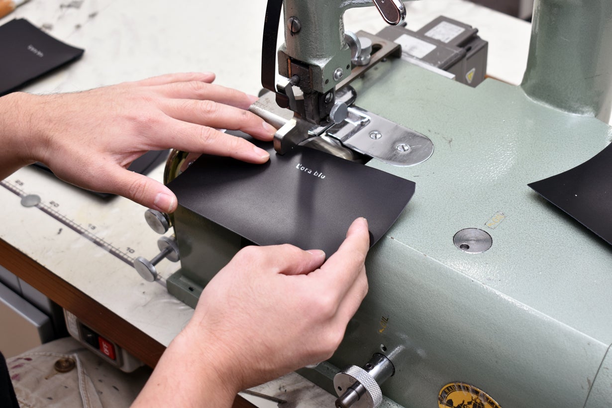 裏面と内側はこだわって選んだ姫路レザー(キップ)を使用し、ヘリの部分に「ネン引き」を施しました。ヘリ先から数ミリの部分に熱いコテで線を引くことでヘリの接着性を高めて耐久性と革の屈曲性を上げ、レザーアイテムの表情を引き締めます。