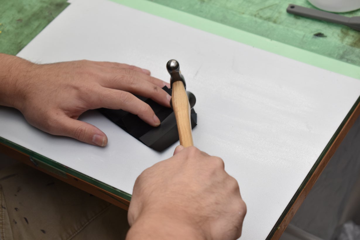 美しい線を入れるためには、熟練の技と手間が必要です。力の加減、道具の角度を調整しながら、最も美しく見える位置に、ちょうどよい太さと深さの線を入れていきます。クラフトマンシップに溢れた技法です。