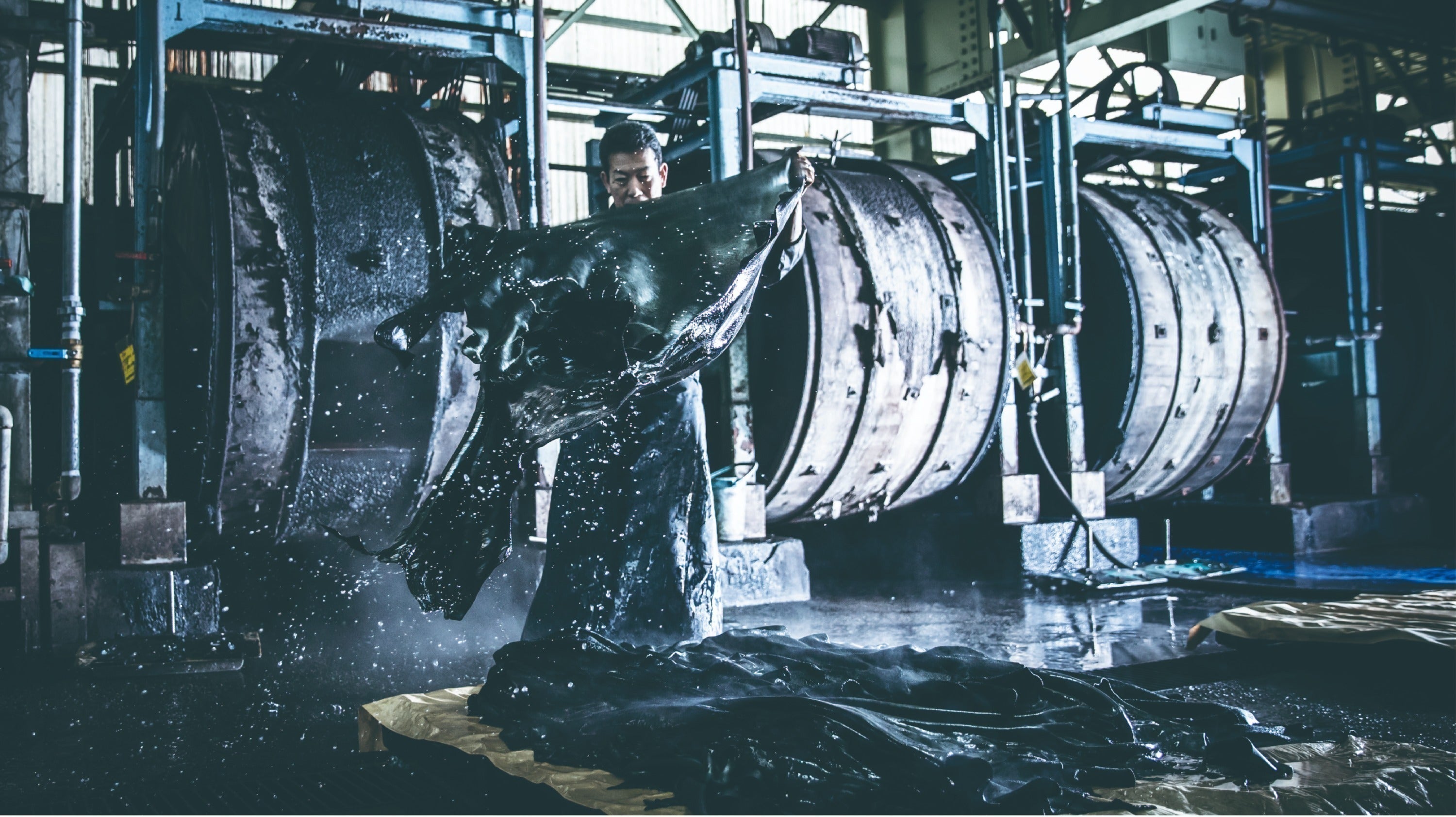 ①メーカーや問屋から注文が入った際、革の色や厚み、柔らかさなど全てを調合し、一から製造します。その過程で、何度も色合わせされ、やっとオーダーメイドの革は出来上がります。