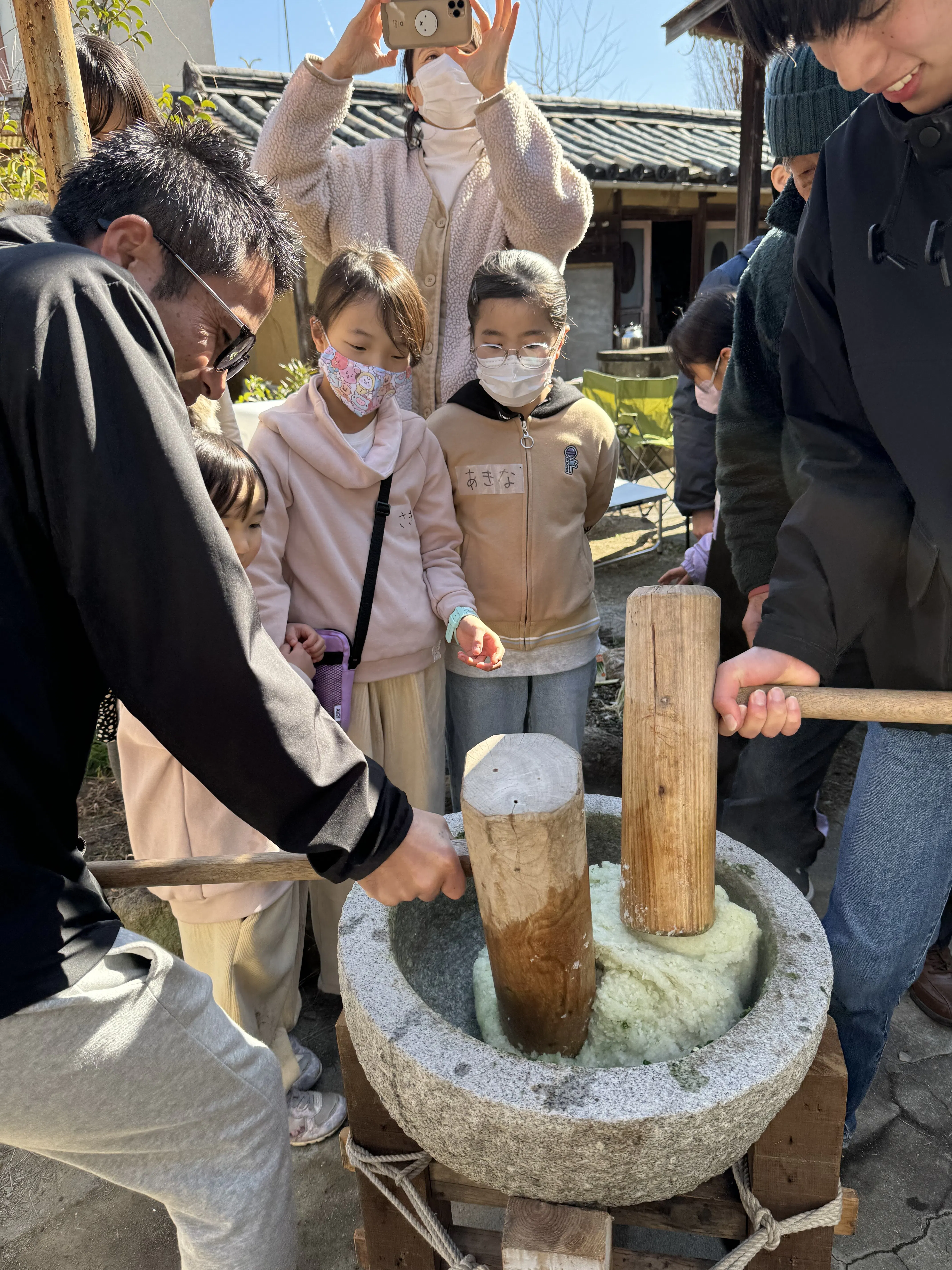 杵と臼のお餅つき。初めてだったこもたくさんいたんじゃないかな?