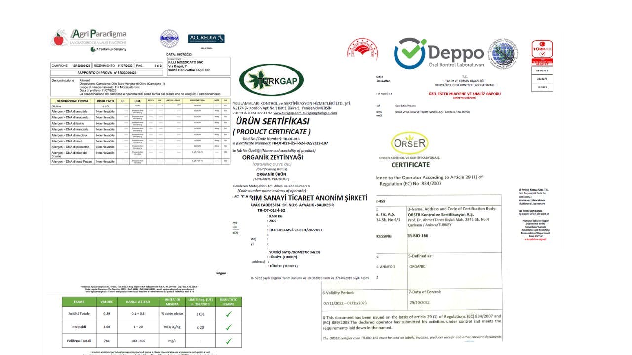 (農園から提出される、様々な証明証。オリーブ栽培に真っ直ぐな姿勢が伝わります。)