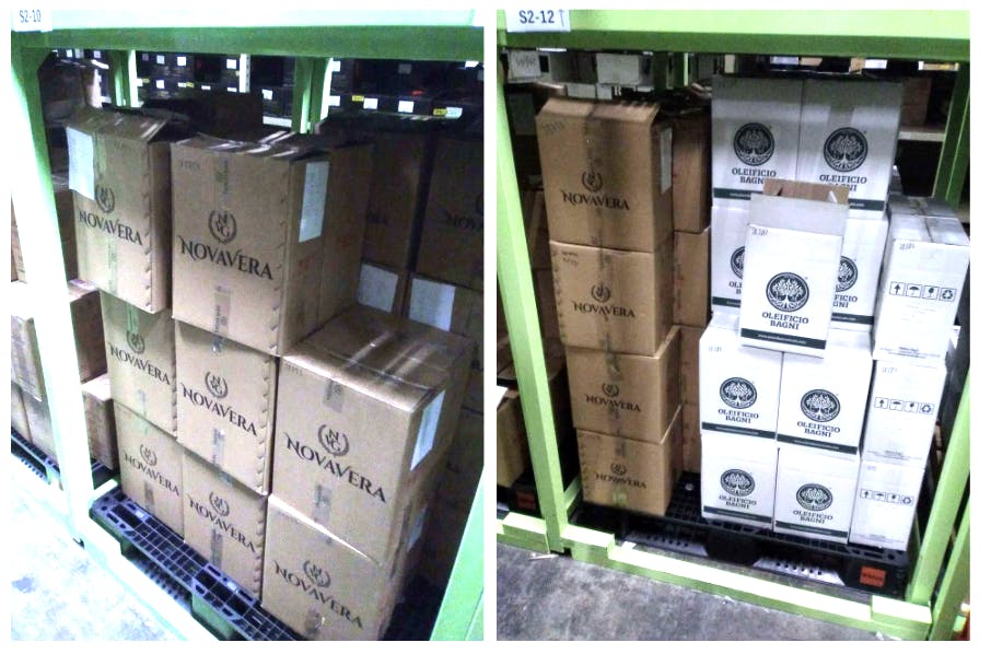 (オリーブオイルが入った箱が低温倉庫で棚に並んでいる様子。この状態で棚が横に並び続けています。)