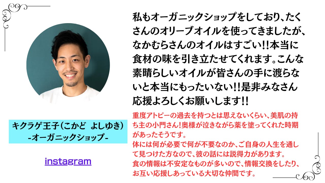 もう、語らずにはいれられなくなりました。私一人だけの知識にするのはモッタイナイ!感じました。最近は野菜にも生産者の顔写真が載る時代。オリーブオイルだって、誰がどんな想いで作っているか、もっと伝えたい!