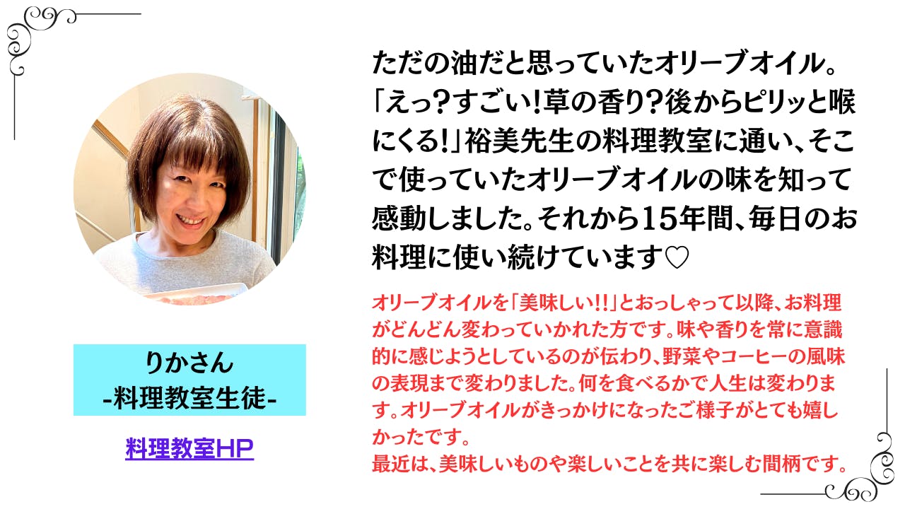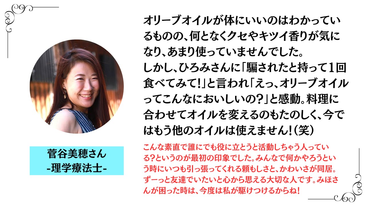 通ってくださる理由を伺うと、『病院の先生にちゃんとしたオリーブオイルを食べなさい』と言われたから、オリーブオイルを探していたらひろみ先生のホームページを見つけました。という方も。