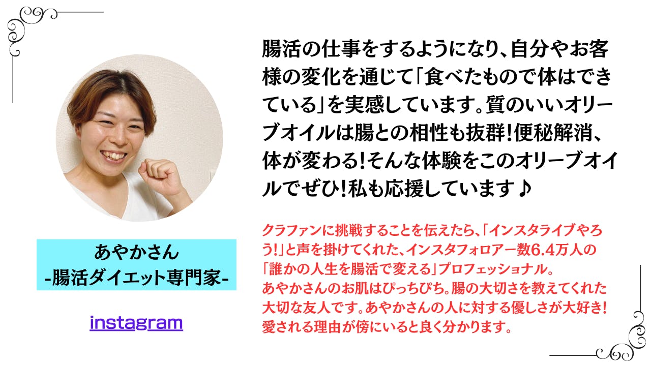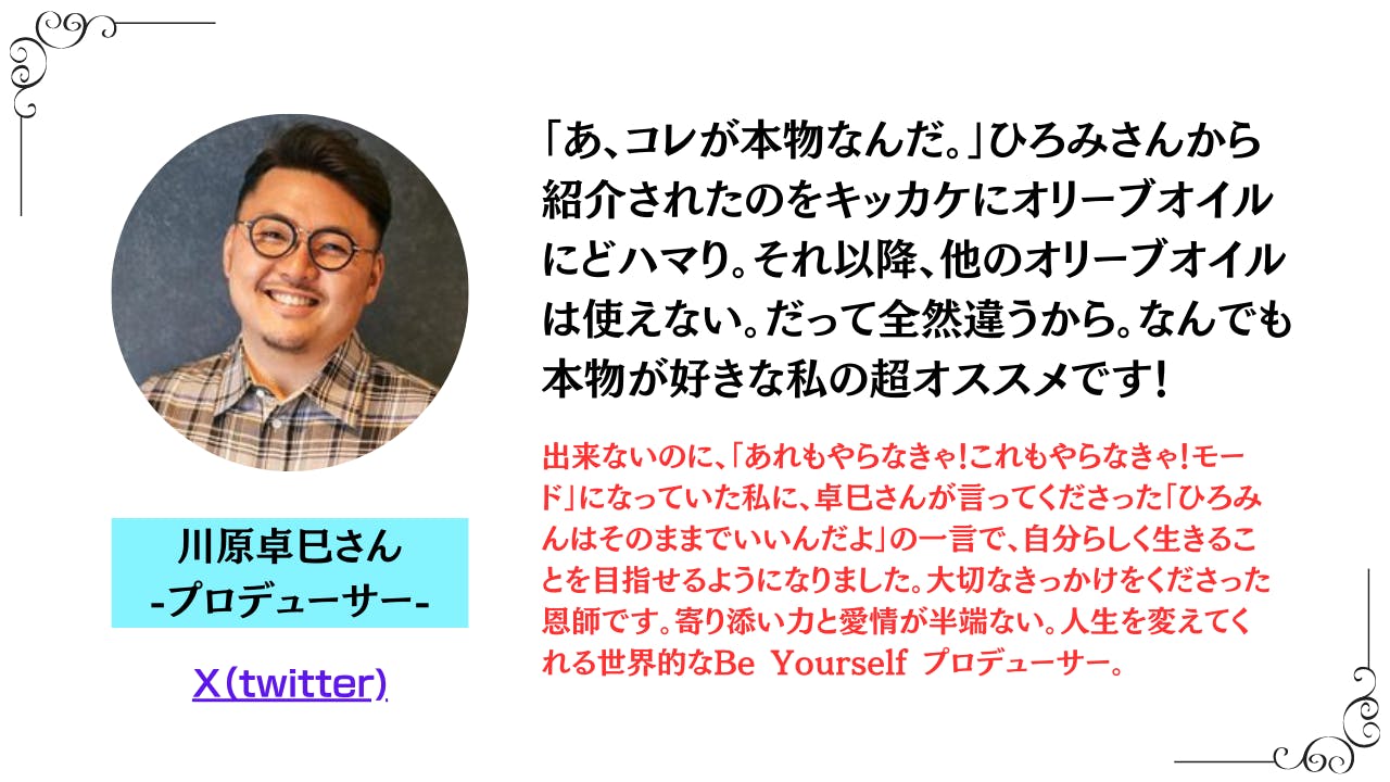 ご紹介のご縁繋ぎでお取引先や、お取引量が年々増え、A社の使用するオリーブオイルを私の会社に品質管理を任せたいというお話や、A社がオリーブオイルを販売してくださるお話、アンバサダー的な立場のお話など話が上るようになり、ここまで頑張ってきてよかったなぁーと、嬉しくて涙が出るような想いでした。
