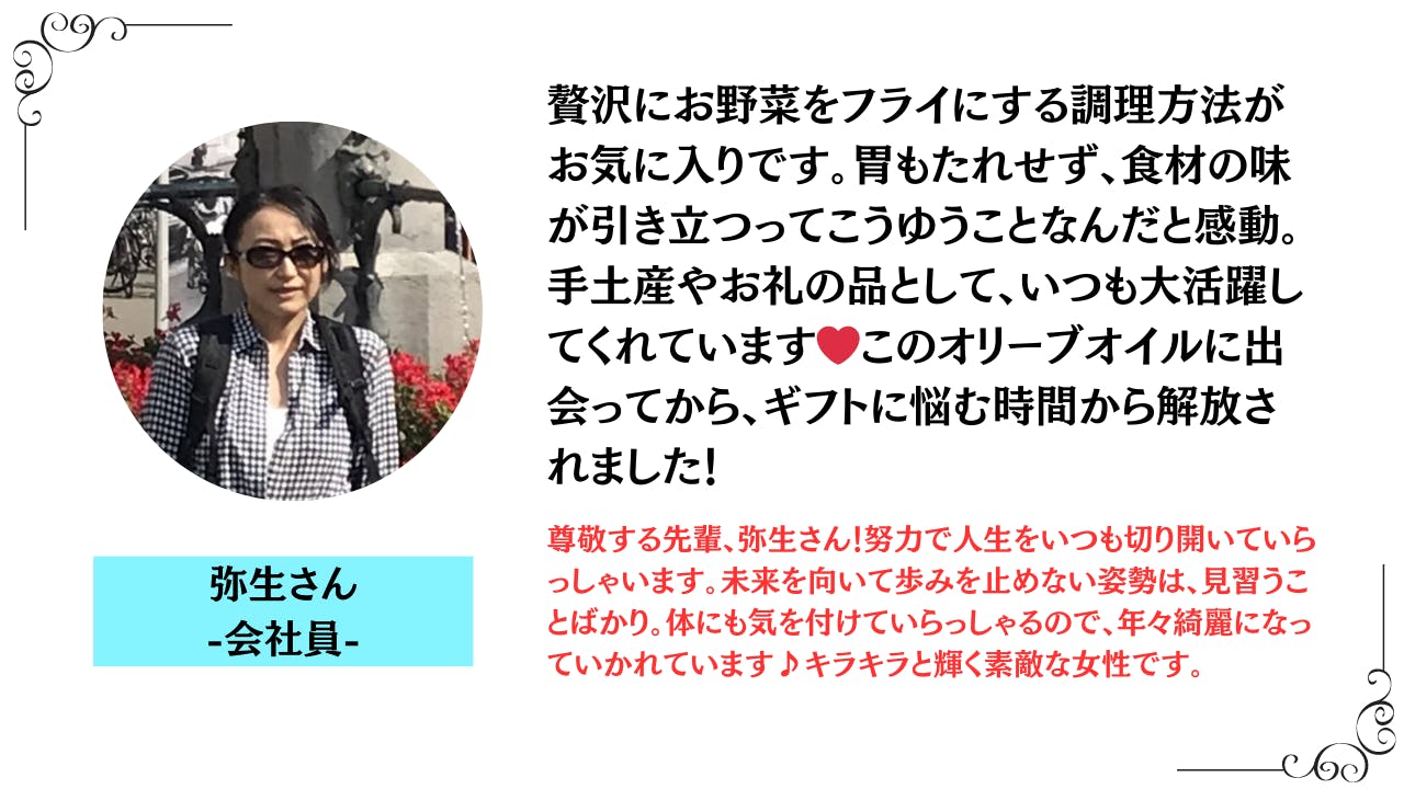 この方は、血圧が高くて薬を飲んでいたのですが、私からオリーブオイルを購入してオリーブオイル以外使わないくらい、なんでもオリーブオイルで炒めるようにしたら、血圧が下がったご様子で、病院の先生に驚かれたそうです。