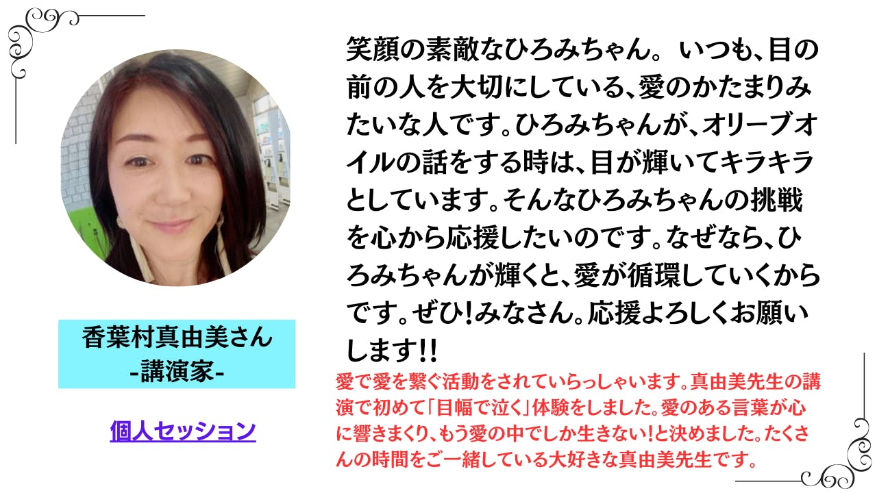 2023/11/18 22:02クラウドファンディングの配送がすべて終了いたしました。たくさんお待ちいただきましてありがとうございました。もしまだ届いていない・・・という方がいらっしゃいましたらお知らせください。(新油をご支援くださった方には、来月のお届けとなります。ハンドマッサージの動画は近日中の配信となります。)そして!!!明日ですが、11/19(日)11:00~12:00、約1時間ほどオリーブオイルの無料セミナーをzoomにて開催いたします!クラウドファンディングに挑戦した時に、こんなにたくさんの温かいご支援をいただけるとは想像もしていなかったので、心から嬉しかったです。皆さんに直接お礼を言いたいなぁ~と思って思いついたのがzoomで繋がれる『セミナー』でした!支援してみたけど・・・実はオリーブオイルのことよく知らない・・・という方も多いはず。1時間という短い時間ですが、よかったら聞きにいらしてください。直接お礼もお伝えしたかったので、よかったらご参加くださいね。ご参加方法:① https://tp1vtrzf.autosns.app/line で公式ラインのお友達になってください。②数字4桁 1119 とだけご入力ください。zoomリンクが届きます。個別のご対応が難しいので自動配信させていただきたく、公式ラインにお入りください。不要な方は終わったらブロックしていただければ結構です。また、今回支援していないけどセミナーは気になる・・・という方も、お越しください♪お待ちしております♪ 中村裕美 もっと見る