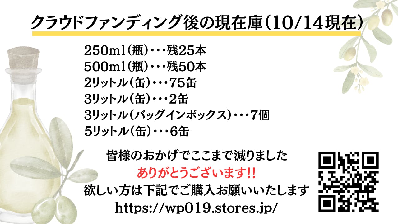 2023/10/13 14:26クラウドファンディングが終了して2週間が経ちました。皆様のおかげで、家の底が抜ける量だったオリーブオイルがここまで減りました。キャンプファイヤーの外で、直接的なご連絡でご購入くださった方もいらっしゃいまして、全部で700件ほどの発送で、毎日発送をさせていただいております。少しお時間をいただきますが、楽しみにお待ちいただけましたら幸いです。届いた方は、ぜひインスタなどでタグ付けしていただけたら嬉しいです!シェアさせていただきます! 中村裕美インスタ:https://www.instagram.com/hiromin.oliveoil/完売を目指しておりましたので、欲しいよー!という方がいらっしゃいましたら、残りわずかですが直接ご購入ください、どうぞよろしくお願いします。 もっと見るみなさま、ありがとうございました!!!