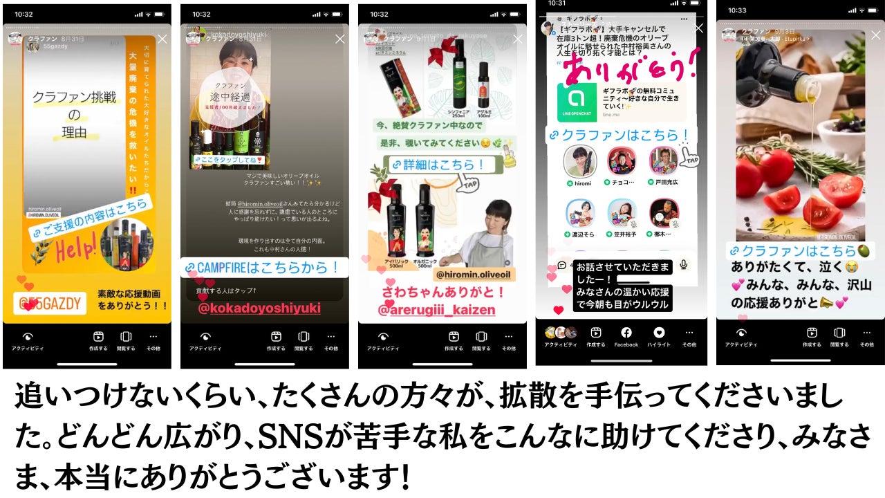 『目標額達成したのだから、違う画像にしよう!画像作ってあげる!』と連絡をくれました。画像を作ってくれたのは小関由規さんです。ご自身の仕事も多忙な中、こんな風に手助けをしてくれる人が今、私の周りにたくさんいらっしゃいます。私には足りないスキルだらけ。そこを埋めるように手伝ってくださっています。私のラインには、いろいろな方のグループラインが出来上がっており、なぜか、みなさん頭に『オリーブ』という文字を付けるので、私のラインには『オリーブ〇〇』がたくさん並んでいます。申し訳ない、という気持ちは少し封印して、『素直に甘える』を学びながら、今は甘えます。感謝しながら甘えます。 みなさま、本当にありがとうございます!!