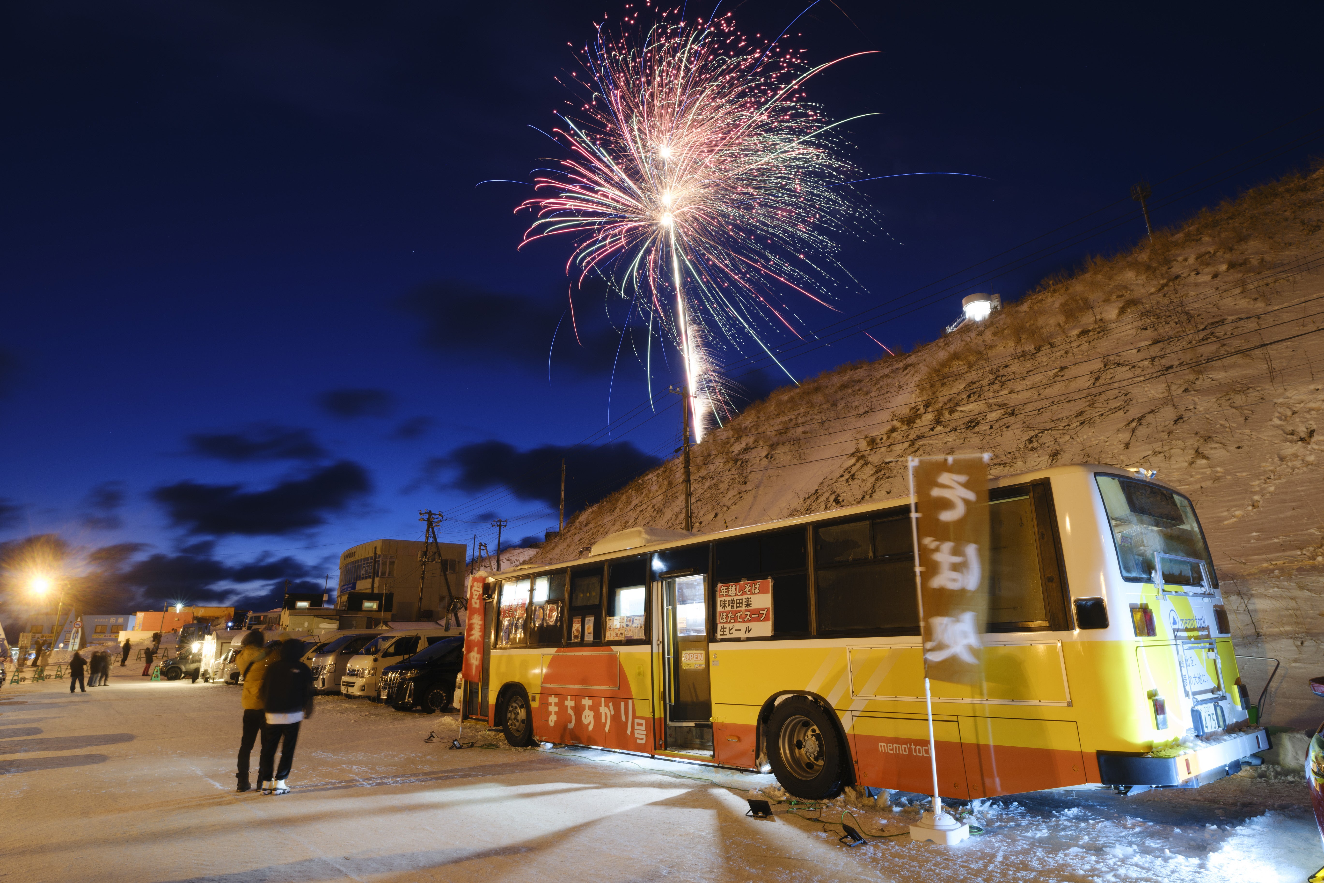 支援者の皆様、いつも応援ありがとうございます。前回の投稿では、ラッピングを終えたまちあかり号の姿をご紹介させていただきました。その後も内装の改造を進め、関係者向け営業を経て、まちあかり号はゆっくりと、しかし着実に成長しています。そしてついに、公の場で営業する初の舞台へ…!その舞台は何と宗谷岬!!しかも年越しイベント!!2025年1月1日 宗谷岬日本本土最北端で有名な宗谷岬では、毎年多くの人が道内外から訪れます。カウントダウンの瞬間や初日の出などをお目当てに、今年は1860人(北海道新聞の報道)もの人が宗谷岬に集結、盛大に新年を祝うイベントとなりました。そんな宗谷岬で2024年大晦日~2025年元日にかけて営業したまちあかり号は、大変多くの注目を集め、のべ200名以上のお客様にご利用いただく大盛況となりました。なかには、遠方からまちあかり号に会いに来てくださった方や、このプロジェクトを知って応援してくださった方もいらっしゃいました。大変ありがたい限りです。稚内市より駐車場での営業許可をいただきました。奥には宗谷岬神社が見えます。今回の特別営業の目玉は、幌加内産年越し蕎麦!!駐車場の中でもひときわ目立つまちあかり号の車体初日の出は雲の切れ間から見ることができました今回は、より多くの方に温かいものをご提供するため、テイクアウトのみでの営業を実施。また、年越し宗谷岬限定ステッカー等のグッズ販売も行いました。この年越し営業を通じて、寒さゆえにドアの凍結、バッテリー問題、車内の断熱問題など多方面に解決すべき点が浮上しました。なすべきことは沢山あります。しかし今回の営業では、地元支援者の方やSNSでまちあかり号を知ってくださった方から、営業できたことへの喜びの声を直接聞くことができました。皆様からいただいたご声援を力に変えて、今回浮き彫りとなった各種課題に向き合い、雪解けの季節からを目標としている一般営業へ進んでまいります。改めてのご案内にはなりますが、まちあかり号はX(旧Twitter)とInstagramに公式アカウントがあります!日々の改造奮闘記や営業に関する案内などをチェックすることができます。ぜひフォローお願いいたします!X→@machi_akarigo(https://x.com/machi_akarigo?t=8WrXBYOWEKvwqsL9bKrw8Q&s=09)instagram→machi_akarigo (https://www.instagram.com/machi_akarigo?igsh=MWQ0OG9iejhtc2Q0eQ==)