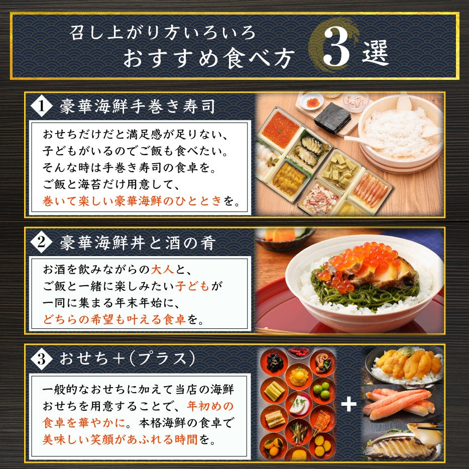 ご支援いただきありがとうございます!!12月に入り、残り16日となってしまいましたが、達成率26%ということで正直伸び悩んでおります・・・今回は、お客様からいただく質問で多かった「食べ方」について紹介させていただきます。海鮮おせちの召し上がり方3選「いつもと違うおせちだから食べ方が分からない・・・」そんなあなたへ、おすすめの食べ方3選を紹介いたします。〜・〜・〜・〜・〜・〜・〜1. 豪華海鮮手巻き寿司〜・〜・〜・〜・〜・〜・〜おせちだけだと満足感が足りない、子どもがいるのでご飯も食べたい。そんな時は手巻き寿司の食卓を。ご飯と海苔だけ用意して、巻いて楽しい豪華海鮮のひとときを。〜・〜・〜・〜・〜・〜・〜2. 豪華海鮮丼も酒の肴も〜・〜・〜・〜・〜・〜・〜お酒を飲みながら楽しむ大人と、ご飯と一緒に楽しみたい子どもが、一同に集まる年末年始に、どちらの希望も叶える食卓を。〜・〜・〜・〜・〜・〜・〜3. 一般のおせちに+(プラス)〜・〜・〜・〜・〜・〜・〜おせち料理は家で作る!という方や、定番の具材は他で用意してある!という方へ、そこに海鮮おせちをプラスしていただくと、お正月感が一気に高まります!もうおせちは頼んじゃったよ、という方へも海鮮を年末に買い回るより、今年は歌津小太郎のおせちを試してみませんか?〜・〜・〜・〜・〜・〜・〜・〜・〜・〜・〜・〜・〜もし、購入を迷われているという方や、こんなことが知りたい、という方がいましたら、お気軽にお問い合わせください!また、近日中にインスタグラムやYoutubeなどで、海鮮おせちの食レポ紹介がされる予定となっておりますので、決まりましたらお知らせいたしますのでお楽しみに!