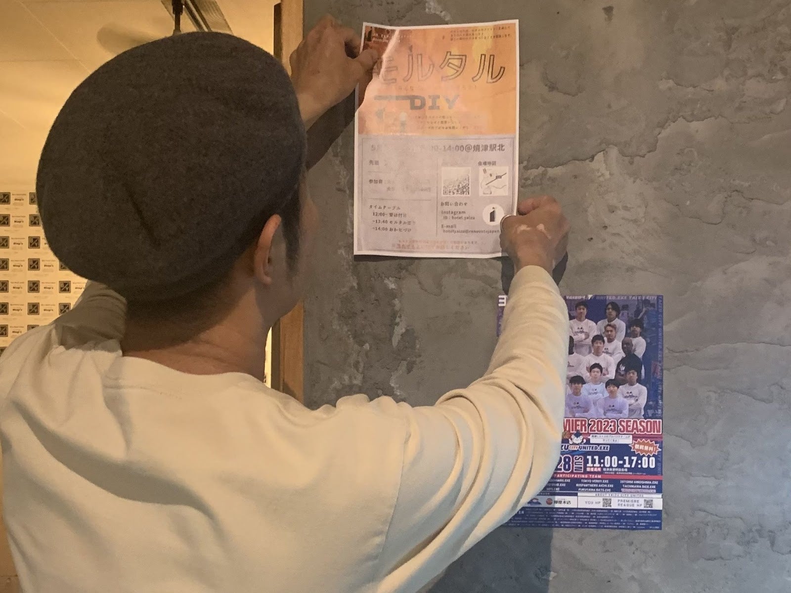 当クラファンのリターンでもイベントスペースとして使用予定のロビー。その壁の一面にモルタルというセメント材を塗ってあるのですが