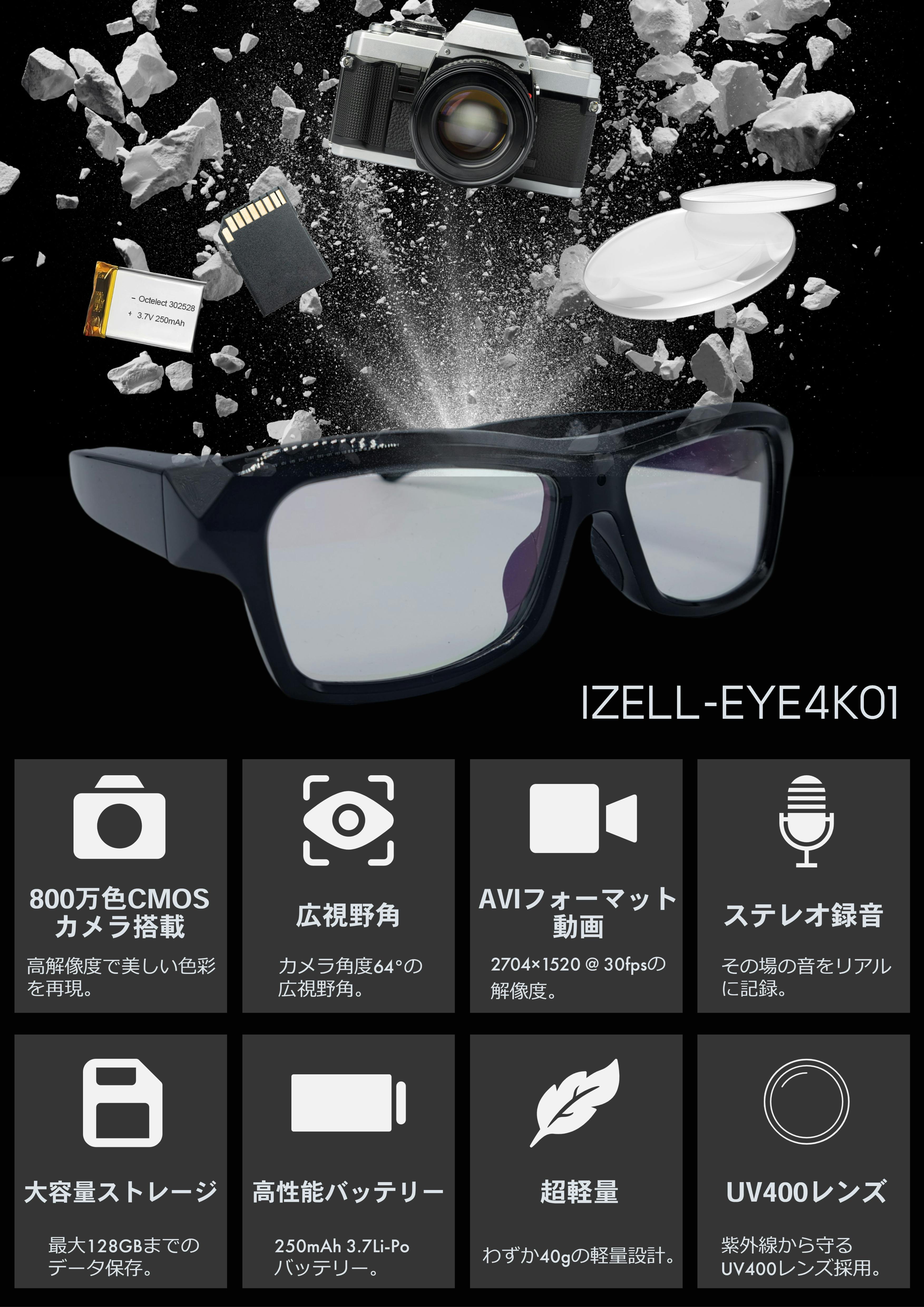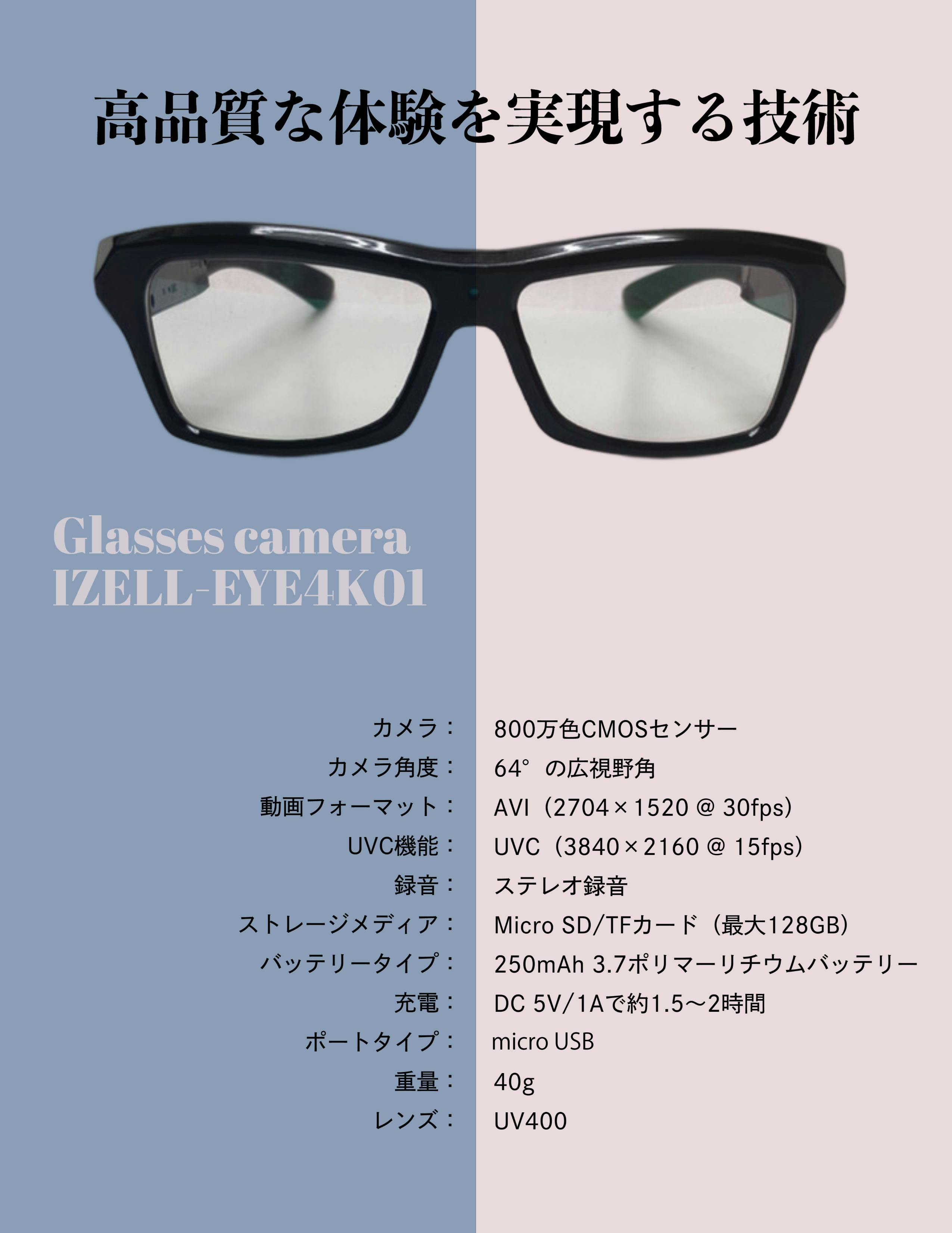 素晴らしい風景や、感動的な瞬間を目の前にして、すばやくカメラを取り出すことなく、そのままの光景を記録できる。それが、このメガネ型カメラIZELL-EYE4K01です。800万色のCMOSカメラと64°の広視野角があなたの視線そのままの鮮やかな映像を切り取ります。手でカメラを持つ必要がなく、ただ見ているだけで、思い出を美しく刻んでいきましょう。