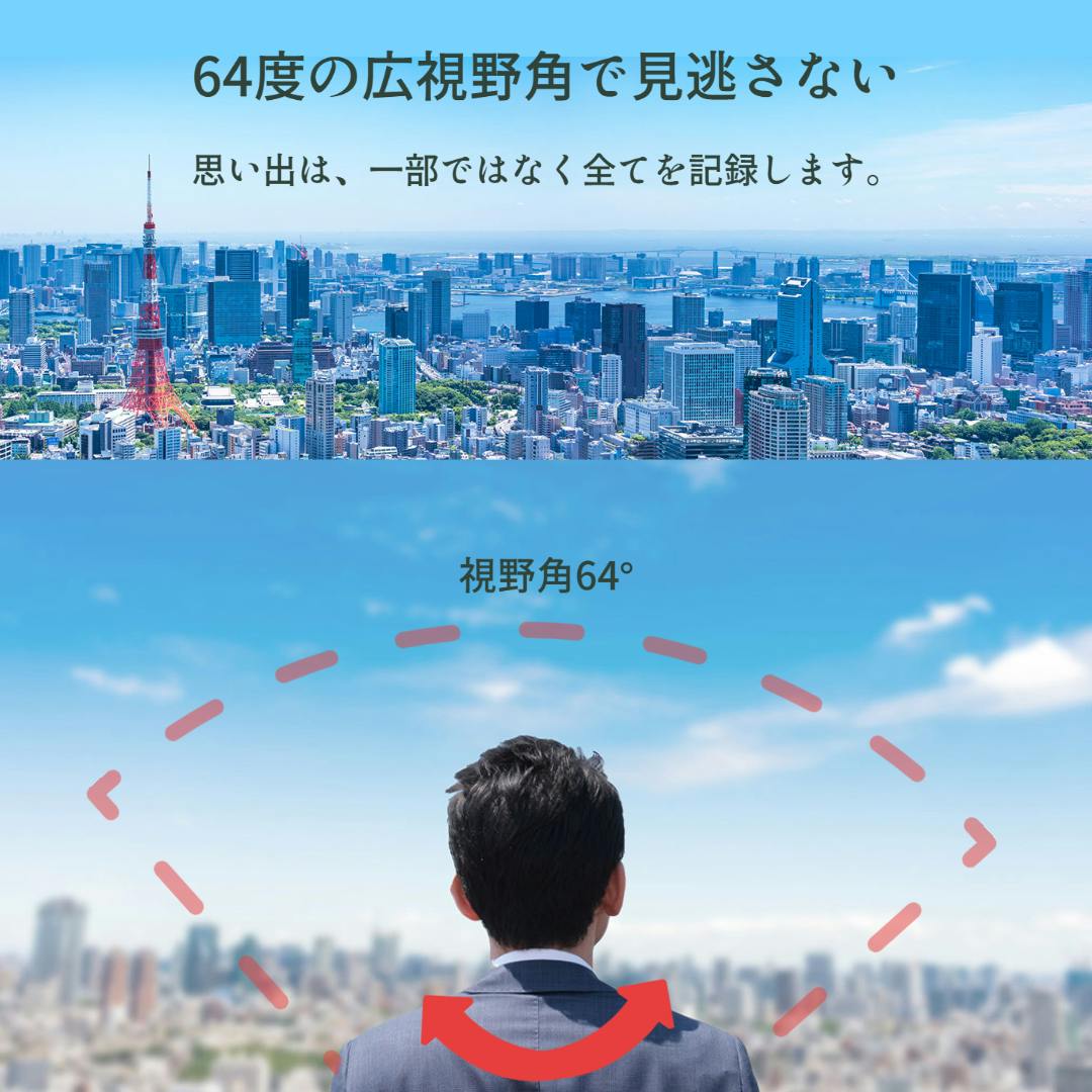一般的なカメラでは、あなたの視界全体をカバーすることは難しく、結果として重要な部分が映像から欠けてしまうことがあります。しかし、この4Kメガネ型ウェラブルカメラは64°の広視野角により、あなたの目が自然と捉えている事象をしっかりと記録します。