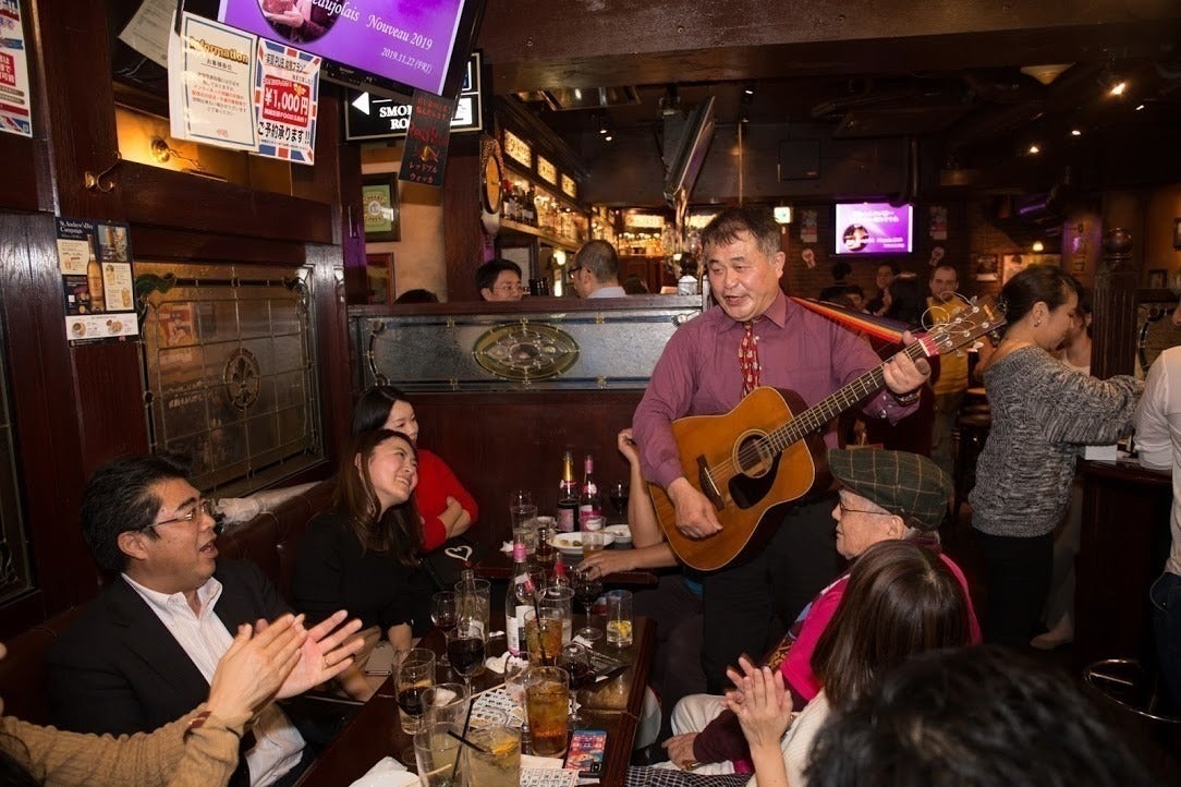 河島英五の名曲『酒と泪と男と女』ならぬ『酒とギターと歌と仲間』をモットーに、宝物のギターを片手に、唯一無二のエンターテイナーとして酒場の夜を盛り上げています。