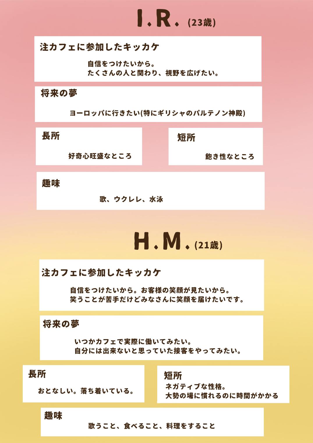 私は、昔から不器用で何をするにも人一倍時間がかかりますが、砂時計の砂のようにゆっくりでも着実に、目標に向かって積み重ねていくように心がけています。この注カフェで自信をつけ、たくさんの人と関わり視野を広げたいです。