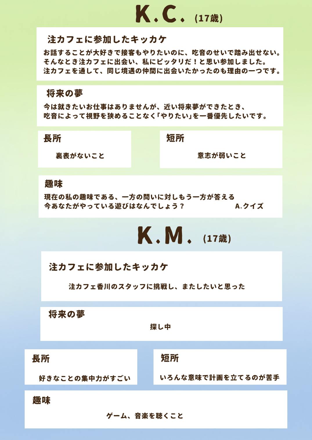 私は結構人見知りで初対面の人だと頭が真っ白になってしまいます。今回の注カフェでちょっとでも人見知りを無くしたいなって思って挑戦しました。もし吃音がでても見守っていただけけたら嬉しいです。応援よろしくお願いします。