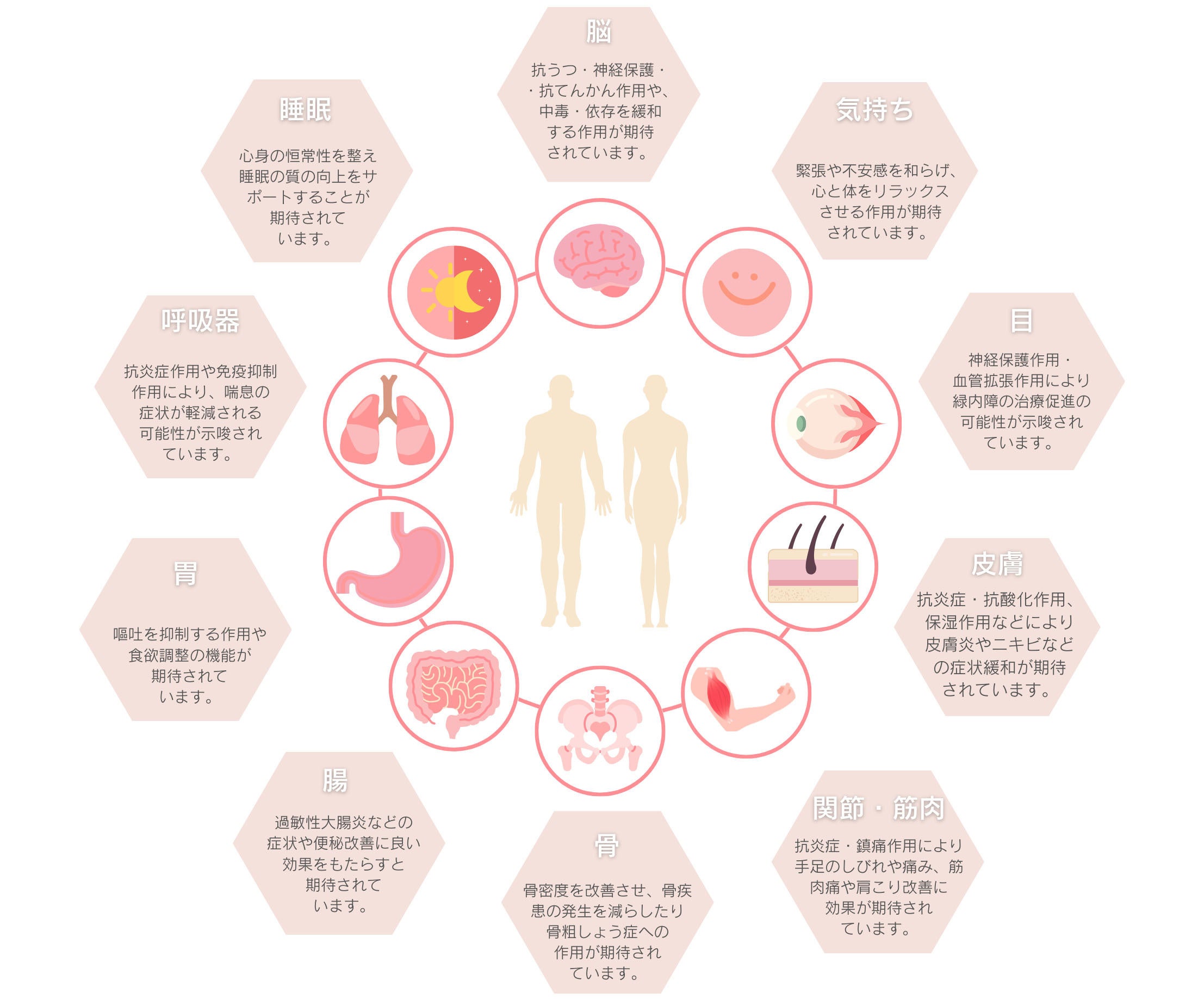 体のいたるところに存在するECS(エンドカンナビノイドシステム)に働きかけ、自律神経を整え、心身の恒常性やホルモンのバランス調整をサポートするとされています。