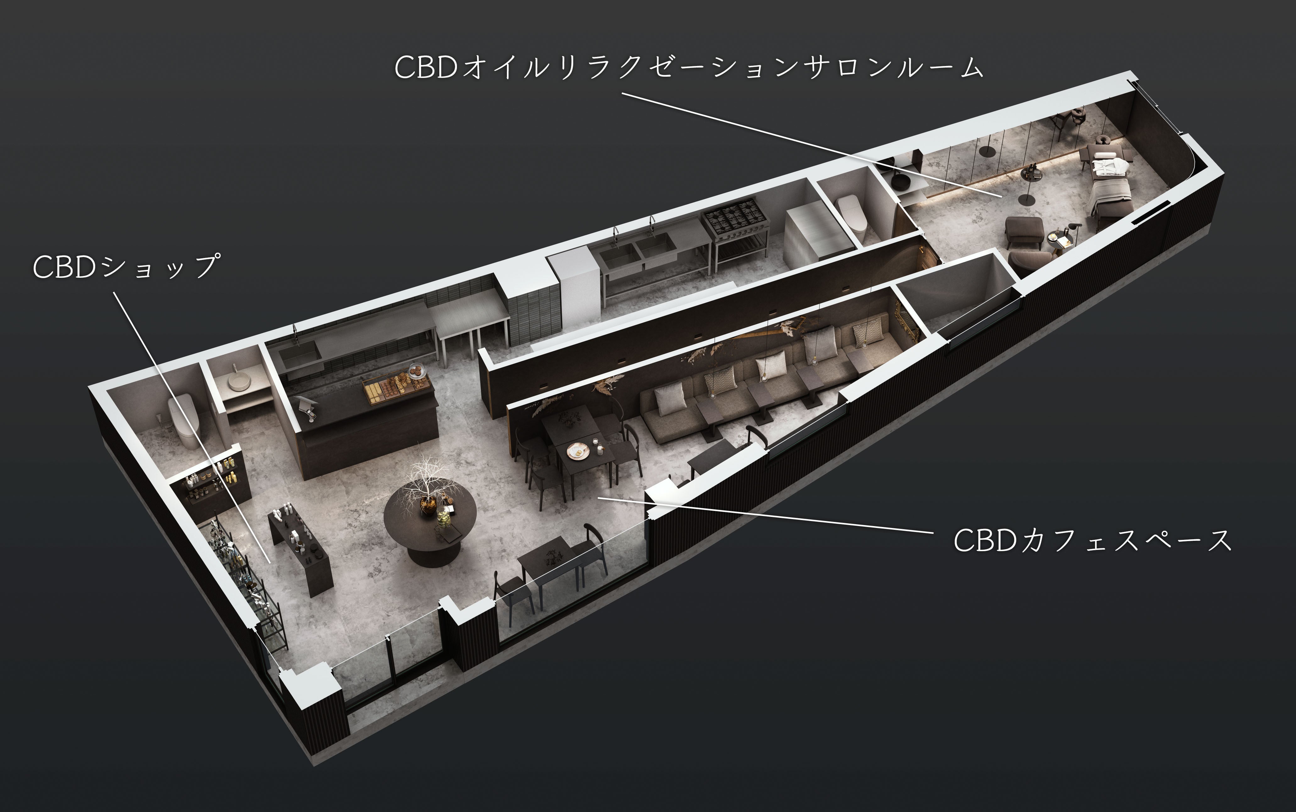 CBDカフェは現在、東京を中心にいくつか存在しています。私たちは、そこにさらにリラクゼーションサロンを併設し、身体を内側と外側の両方からリラックスさせ、筋肉・表皮に至るまで全身のケアを行える複合施設を提案します。