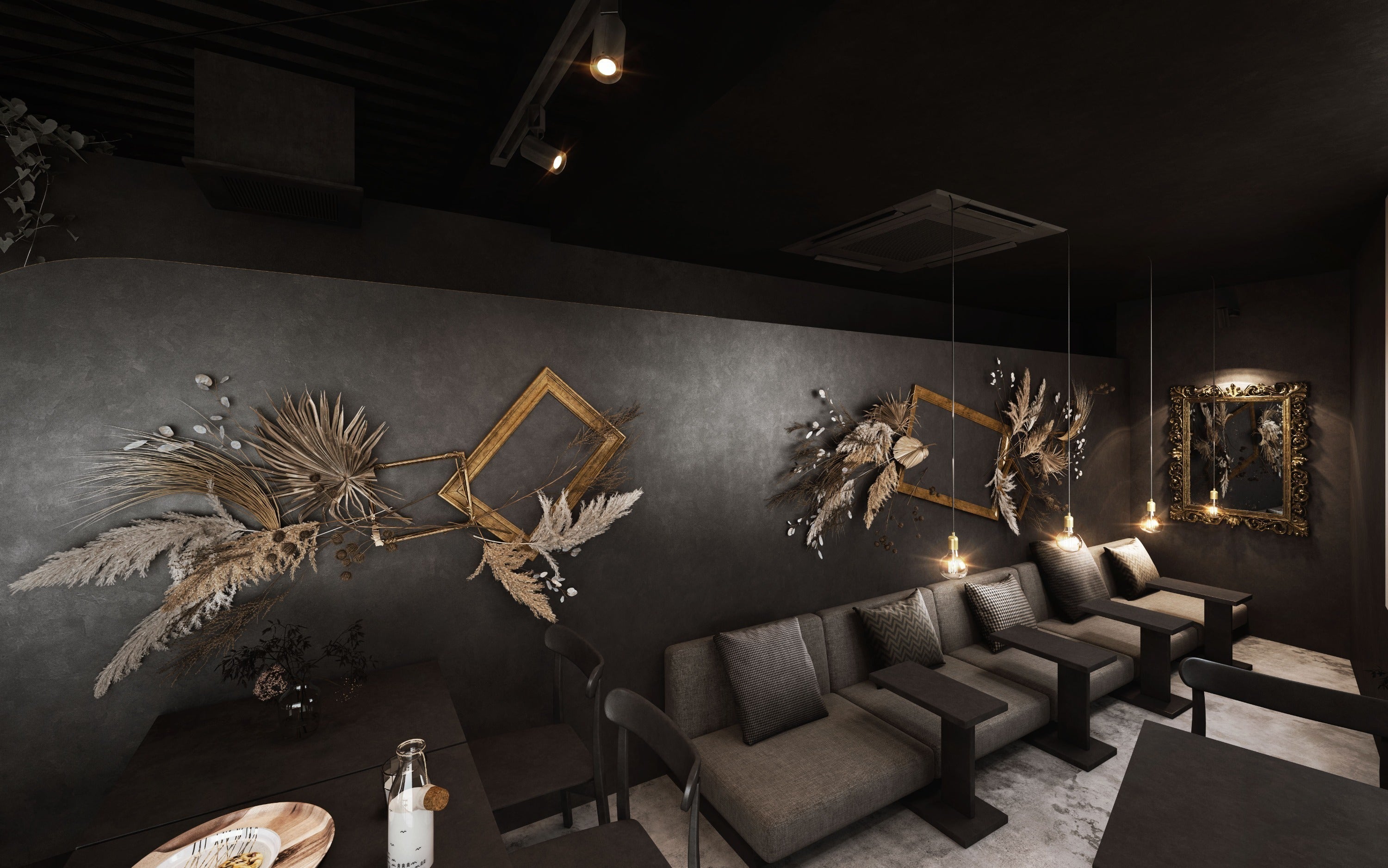 ▲カフェはダークグレーと金を基調としたデザイン。