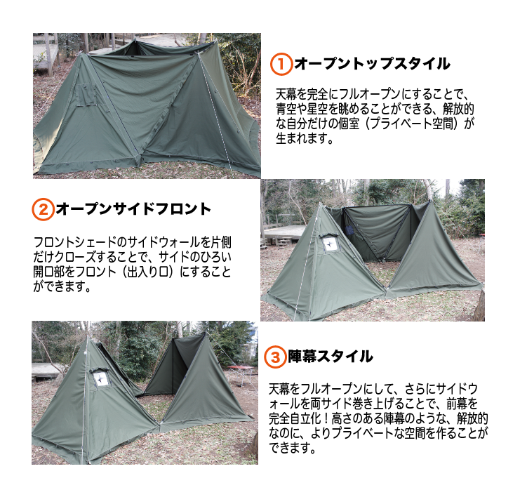 基本形態であるパップテントスタイルに前幕をファスナーでジョイントすることで、 「transHOME-EX/OPEN-TOP」はテント内の広さが通常のパップテントの約3倍の広さを作り出すことができます。4面あるサイドウォールの組み合わせで、両面開放型のフロントシェードスタイルや、片面クローズで横面大開口の出入り口が確保できる、サイドフロントスタイル。まるで2ルームテントのような空間を創り出すことが可能です。組み合わせで演出できるスタイルは無限大!あなたの空想でファミリーキャンプがより一層楽しいものになるはずです。