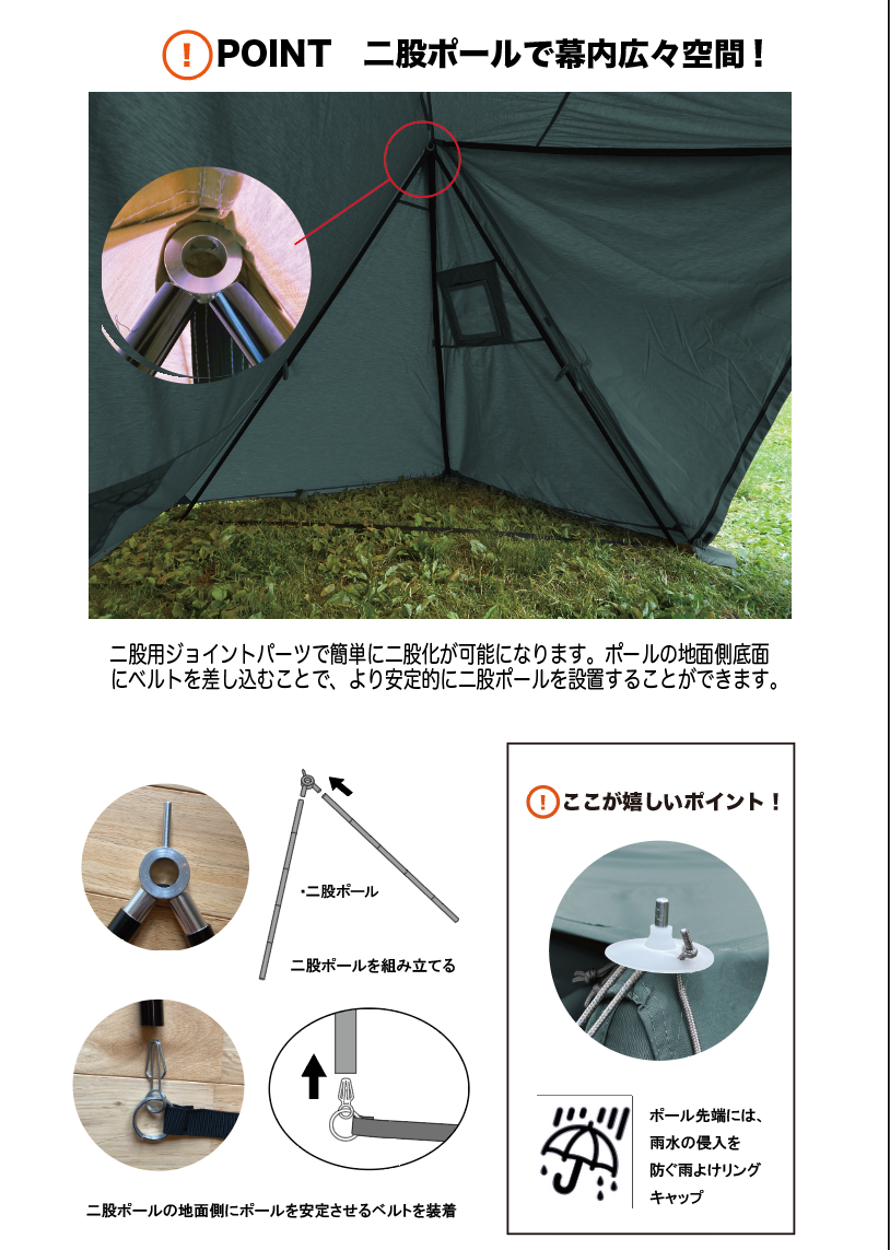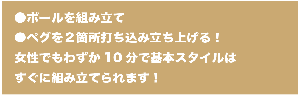 ワンポールテント同様の簡単な設営で、女性でも楽々設営が可能です!