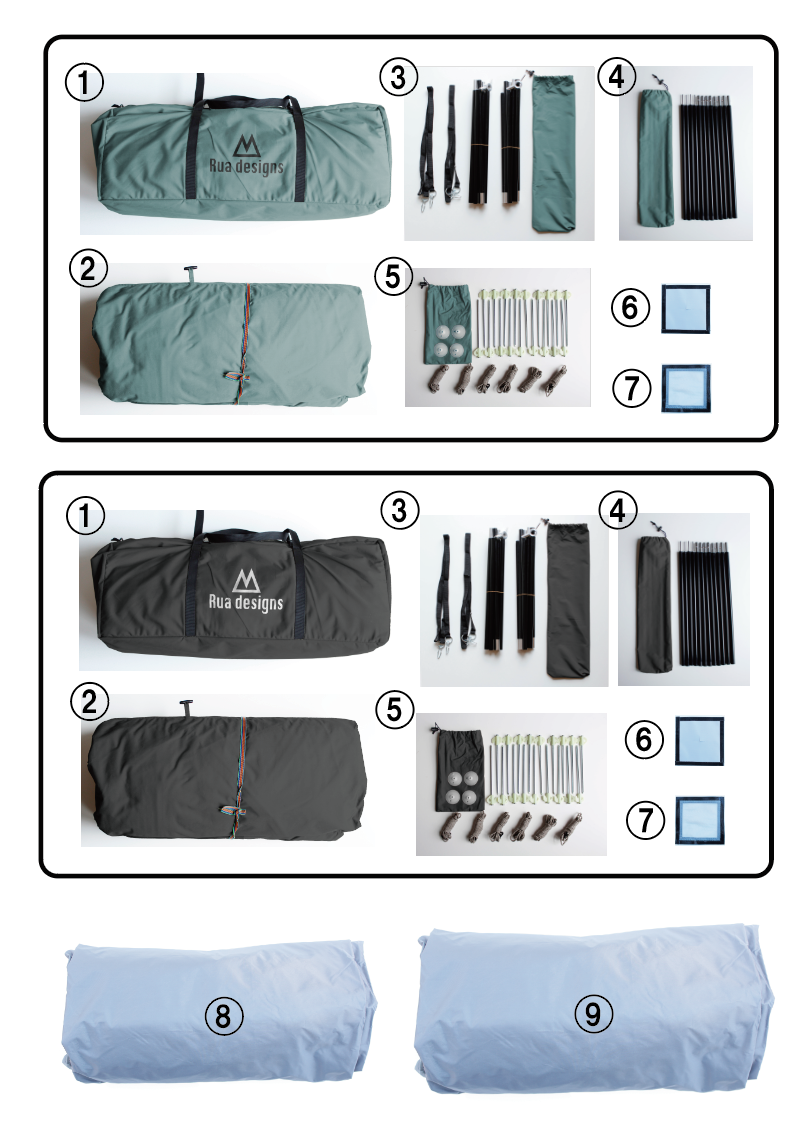 ⑤ペグ18本 ロープ18本 雨よけキャップ4点(うち2点はテントに装着)