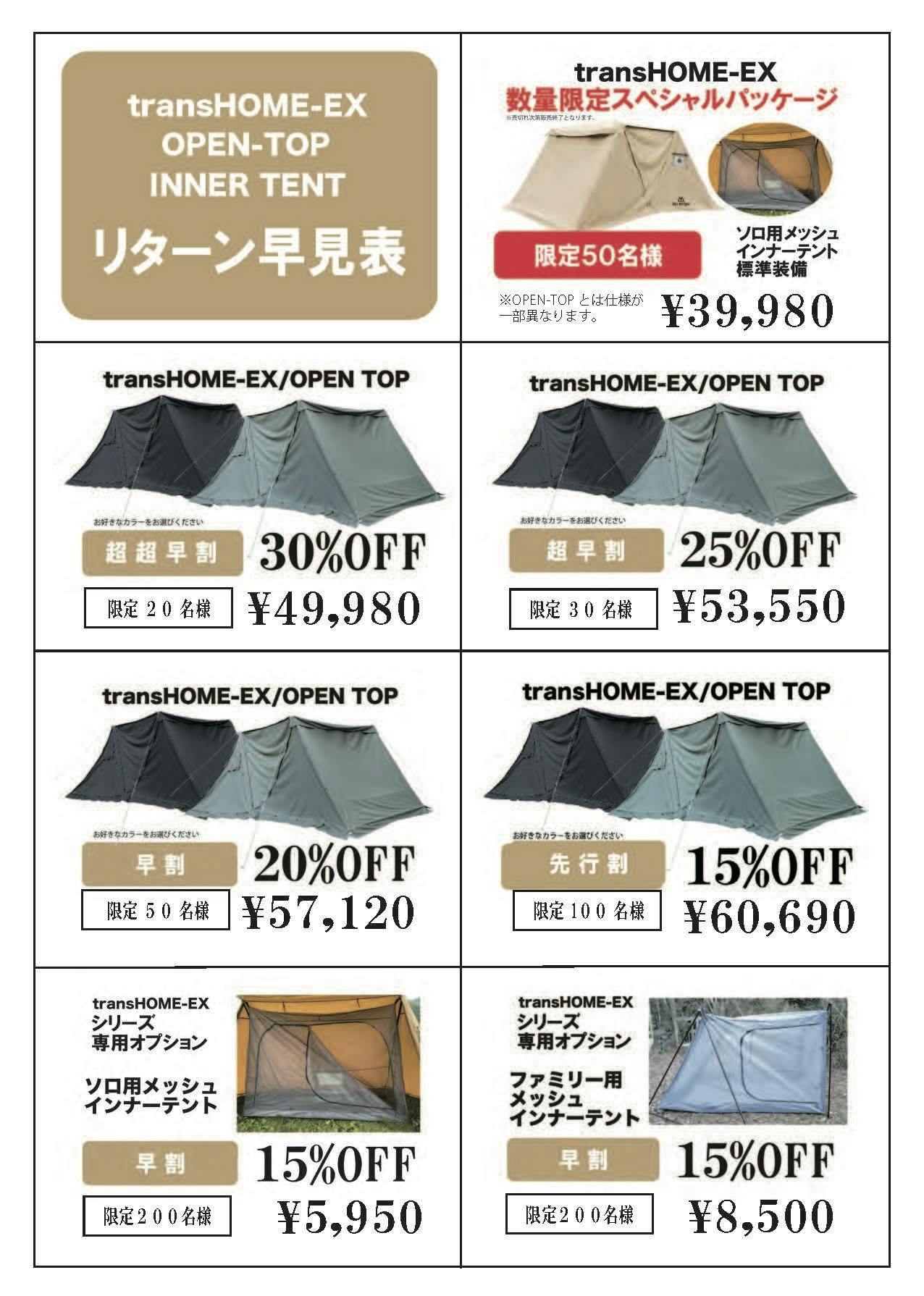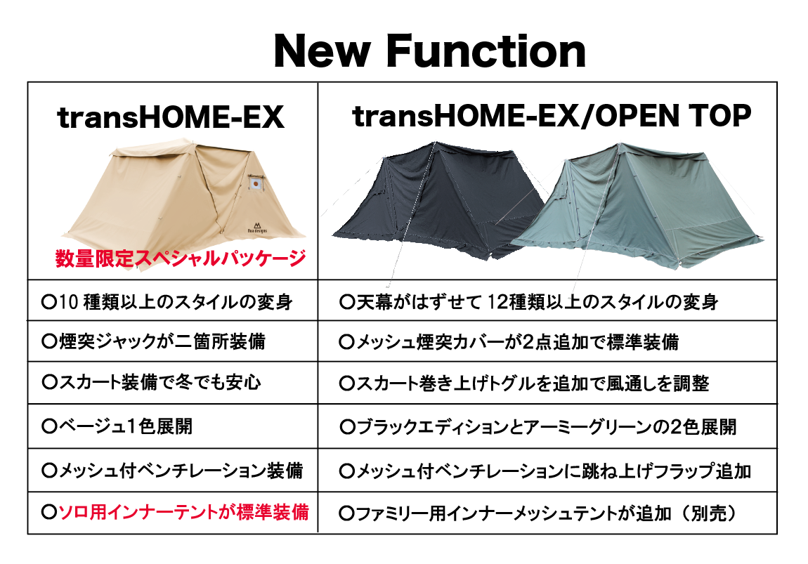 「transHOME-EX/OPEN-TOP」 の最新機能!屋根部分がフルオープンとなり、青空や星空を眺めることができます。前幕のサイドスリット後方にもハトメを追加したことで前幕が単独で自立することが可能になったため、オープントップスタイル以外にも新たなトランスフォーム(変身)が追加されました。