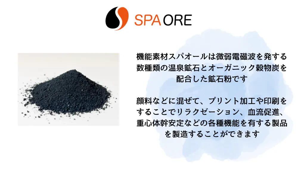 高機能素材SPAORE(スパオール)は独自の鉱石の選択や配合比率により脳のリラックス、血流促進、重心・体幹の安定(特許取得)など以下の効果が期待されます。