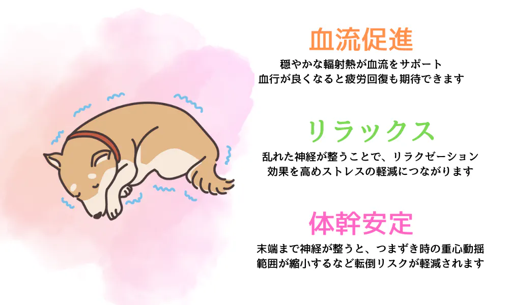 健康な犬にも健康寿命をのばすための効果が期待できます。スパオールの自然で穏やかな輻射熱が広範囲の血流をサポートします。血行が良くなると疲労回復にも期待できます。乱れた神経はコンディショニングされることで副交感神経優位への切り替えがスムーズになり、リラクゼーション効果を高め、ストレスが軽減されると言われています。末端の神経まで整うと、つまずき時の重心動揺範囲が縮小するなど転倒リスクが軽減されます。