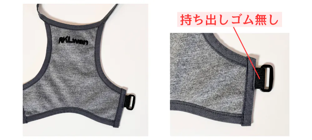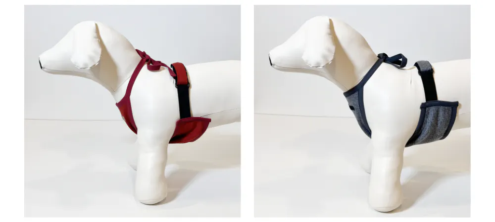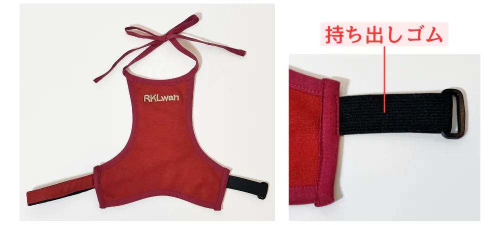 ワンちゃんの負担にならないよう固さや引っ掛かりの気になるボタンは使わず、首回りは伸縮するひもタイプにしました。