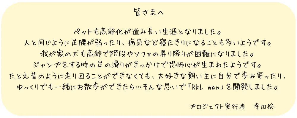 RKL wanシリーズによって少しでも多くのワンちゃんたち、飼い主様の力になれるよう精一杯心を込めて製品を開発しましたのでご支援、ご声援をどうぞよろしくお願いいたします。
