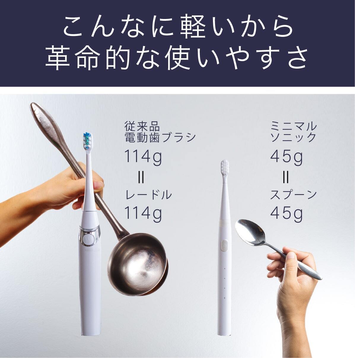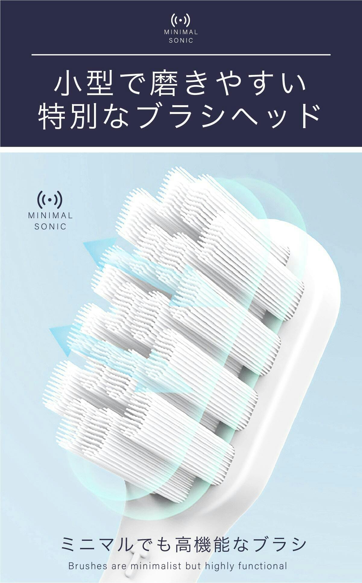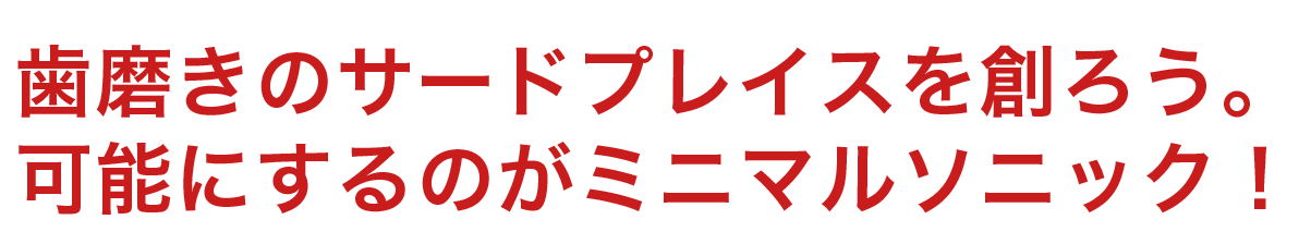 今までの電動歯ブラシを大きいと感じたことはありませんか?普通の歯ブラシから電動歯ブラシに変えた時にそれを大きく感じると思います。電動歯ブラシは構造上、大型化してしまうのですが、常識に囚われずまったく新しい電動歯ブラシを設計したのがこのミニマルソニックです。画期的な構造で小型でパワフル。未来の体験をはじめましょう。