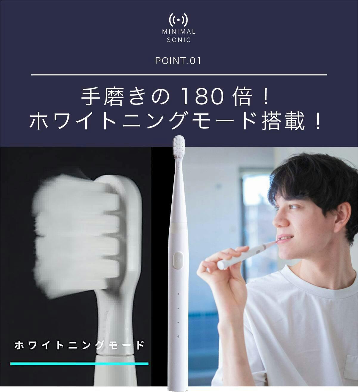 手磨きの180倍!ホワイトニングモード搭載!手磨きで追いつくには6.1時間も磨き続けないといけません!ミニマルソニックは既存の60%も軽量化!おたまがスプーンになったかのような使いやすさ画期的!私達は歯磨きのサードプレイスをご提案!IPX8仕様でお風呂場で使えます。3時間充電で30日間使える。