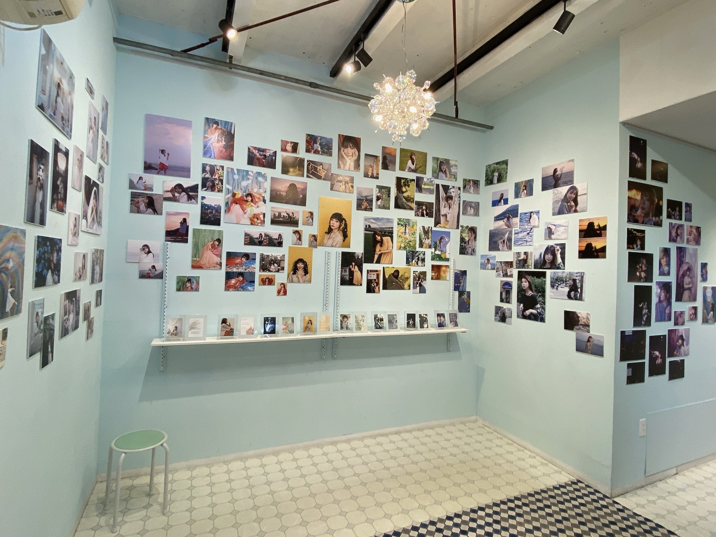 水色の壁を空に見立て、色とりどりの写真で虹を架けました⭐︎