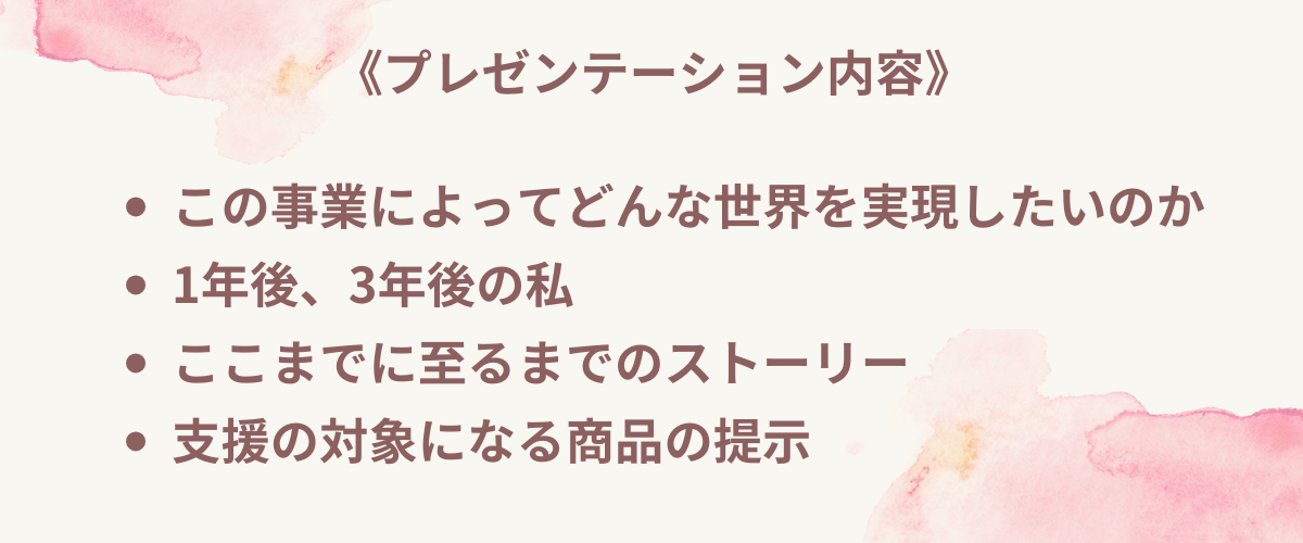 アドバイザーとして、モデルプレゼンターの方達の事業についての方向性・良い点・今後の課題についてコメントをしていただく予定です。