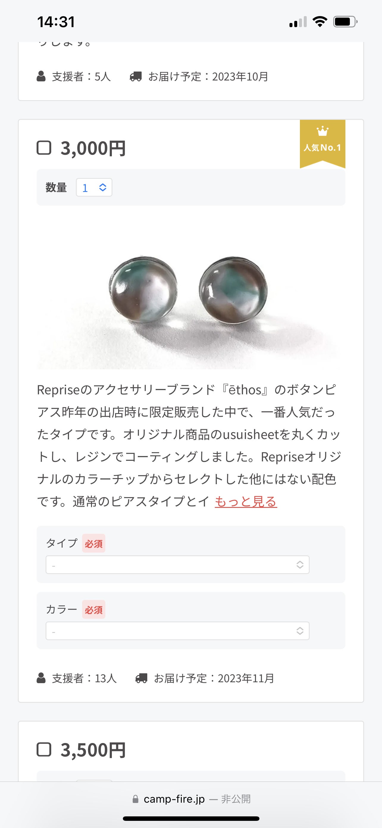パソコンからはカラータイプが確認しやすいのですが、スマートフォンからだと【プロジェクトを支援する】ボタンを直接押してしまうことで下記の画面に遷移してしまい、ここではカラータイプが確認できません。