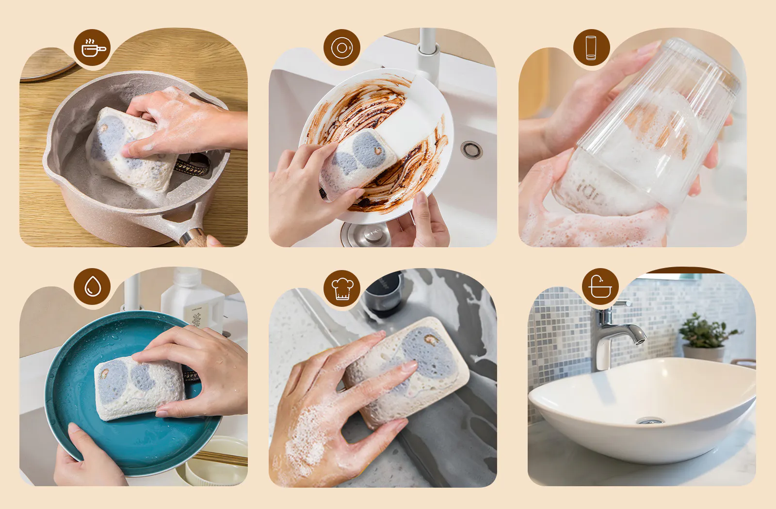 台所の掃除、食器洗い、テーブル、バスタブや洗面台の掃除など様々な掃除活動に幅広く使用されています。