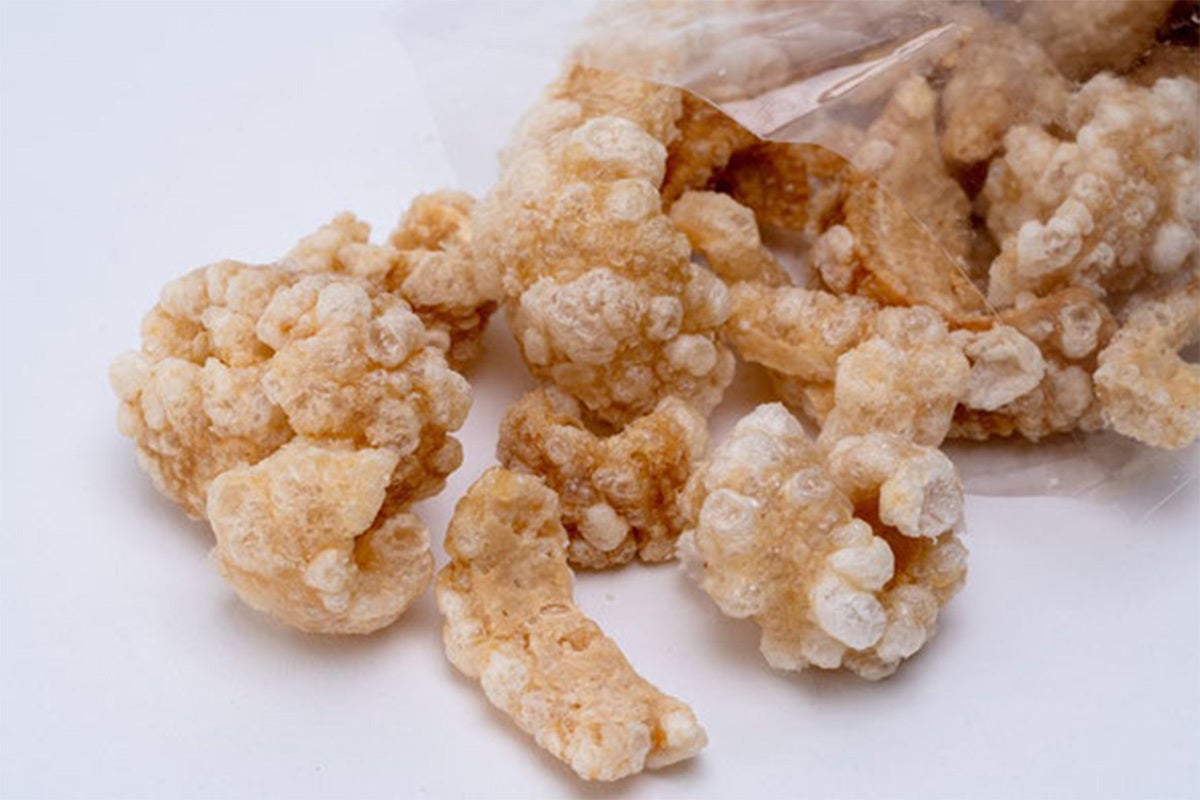 龍華のアンダカシーは…豚の皮や背脂をラードで揚げたおやつ。食べるものが豊富でない時代に沖縄で食べられていた豚の皮を使ったおやつで、豚の旨味が詰まったカリカリの食感で1度食べ始めると病み付きになる。