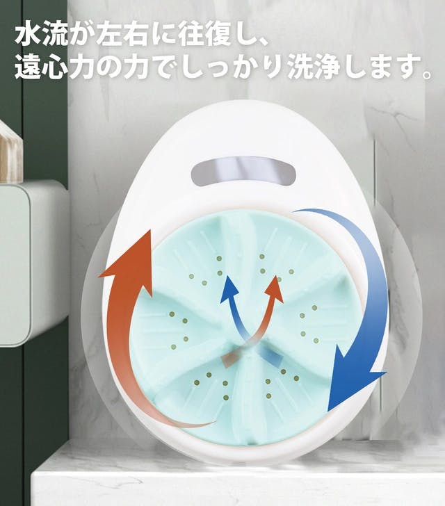 コンパクトながら普通の洗濯機のように左右に反復して回転します。また手洗いのように優しく洗濯し、服に優しいです。