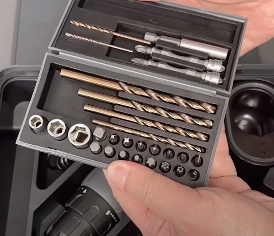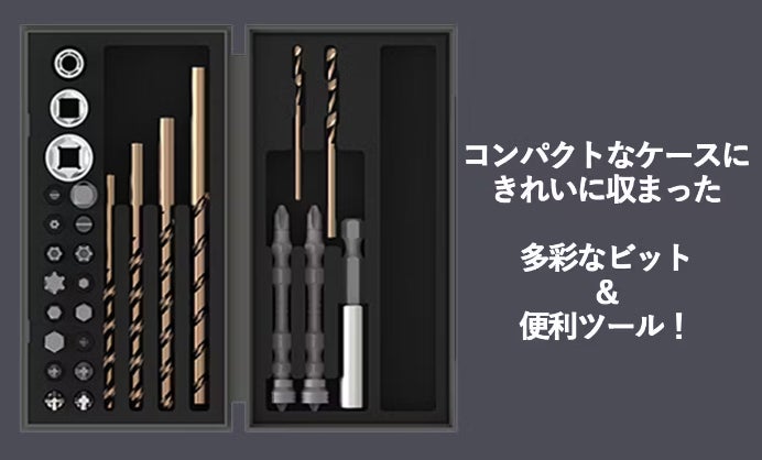 さらに、JIMIBOX X1-Cにはコンパクトなケースにきれいに収まった多彩なビットと便利ツールが付属しています。穴開けからねじ締めまで、あらゆるDIYプロジェクトで役立つ各種ビットが充実しており、6本のドリル、3本のスリーブ、16本のドライバーが含まれています。
