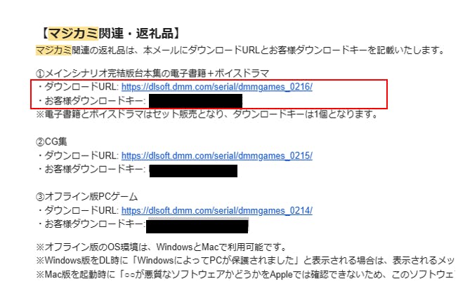 1、デジタル返礼品の「ダウンロードURL」と「ダウンロードキー」が記載されたメールを開いてください。記載されているURLとダウンロードキーを使ってDMM GAMESよりダウンロードを行ってください。※ダウンロードキーはお客様ごとに異なります。