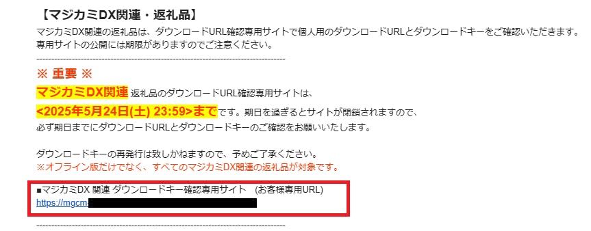 マジカミDX返礼品ダウンロードURLとダウンロードキーが表示されますので、ご利用ください。※ダウンロードキー確認URLはお客様ごとに異なります。