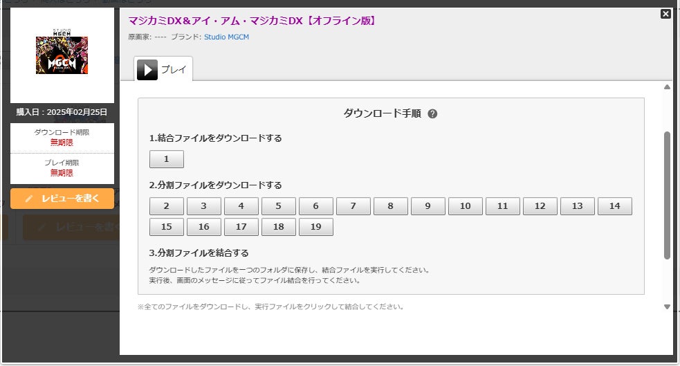 DMM GAMES/FANZA GAMESより、「結合ファイル」と「分割ファイル2~15(マジカミの場合)」「分割ファイル2~19(マジカミDXの場合)」をすべてダウンロードします。