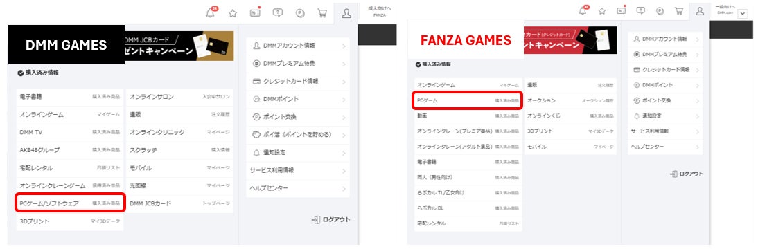 また、以下の図のとおり、DMM GAMESまたはFANZA GAMESへログインを行い、右上の人型アイコン→「購入済み商品一覧」からも同ページにアクセスできます。